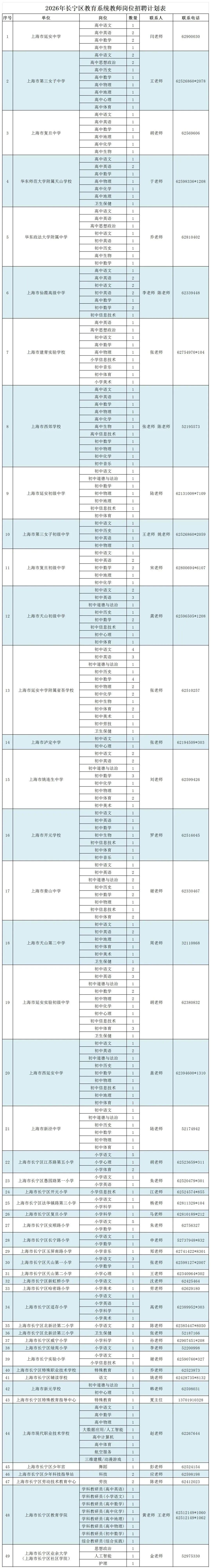 附:2026年长宁区教育系统教师岗位招聘计划表