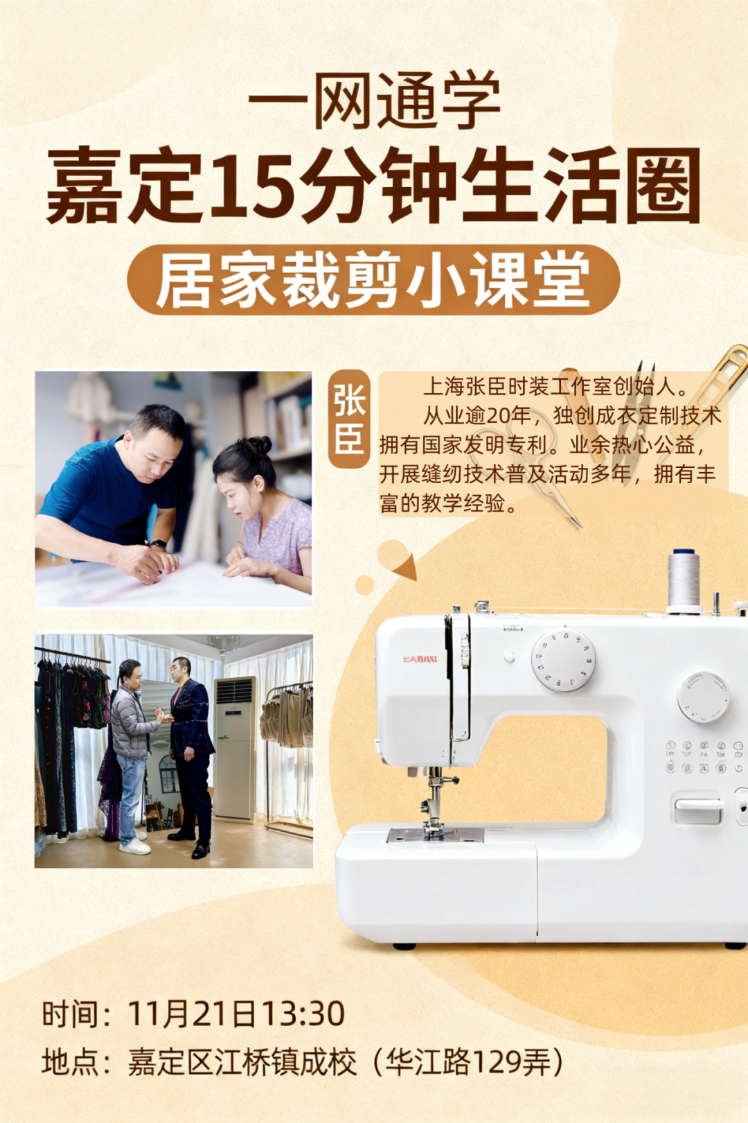 主讲人张臣是江桥生活圈的“能人”,从业逾20年的他不仅是上海张臣时装工作室创始人,更凭借独创的成衣定制技术手握国家发明专利。多年来,他热心公益普及缝纫技术,积累了丰富的教学经验,成为“生活圈里的名师”。
