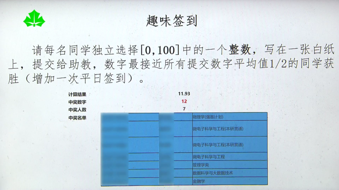 用博弈论签到,是一种怎样的体验?在复旦大学,马克思主义研究院教师陈俊昆在课前出了这样一道题:请每名同学独立选择0到100中的一个整数,数字最接近所有提交数字平均值1/2的同学获胜,可增加一次平日签到。看似简单的题目,背后却暗藏玄机,学生们提交的数字也是五花八门。
