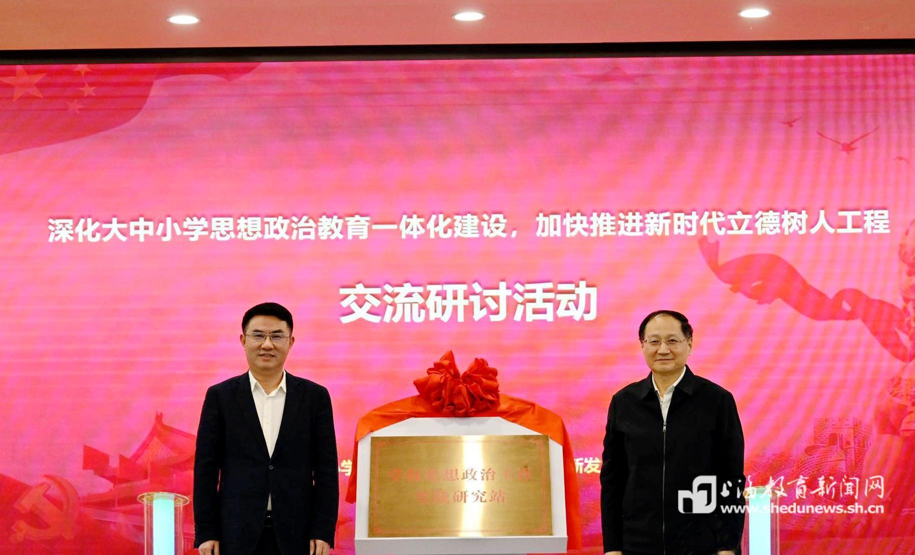 教育部思想政治工作司司长魏士强与大中小学思想政治教育一体化建设创新发展中心主任、上海开放大学党委书记闵辉为学校思想政治工作实践研究站揭牌