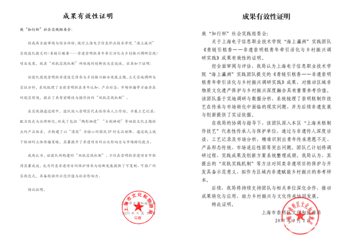 近日,2025年“知行杯”上海市大学生社会实践大赛颁奖仪式举行,上海电子信息职业技术学院经济与管理学院“海上瀛洲”实践团队凭借“非遗崇明糕青年牵引活化与乡村振兴调研实践”项目,从众多参赛队伍中脱颖而出,一举斩获一等奖。该项目通过产品革新与品牌活化“双轨并行”模式,成功激活崇明糕这一非遗IP,为非遗赋能乡村振兴提供了可复制的青年实践方案。