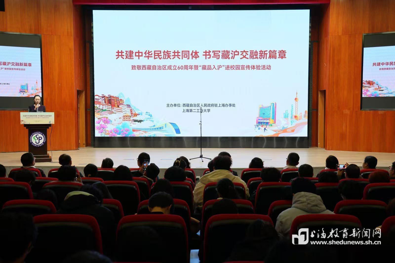 本网讯(记者 程媛媛)12月17日,致敬西藏自治区成立60周年暨“藏品入沪”大中小学思政教育一体化育人活动在上海第二工业大学举行。本次活动以“共建中华民族共同体 书写藏沪交融新篇章”为主线,通过西藏自治区成立60周年图文展、非遗体验、特产品鉴、政策宣讲、文艺交流等为载体,打造了一堂覆盖多学段、联结多学校的“大思政课”。