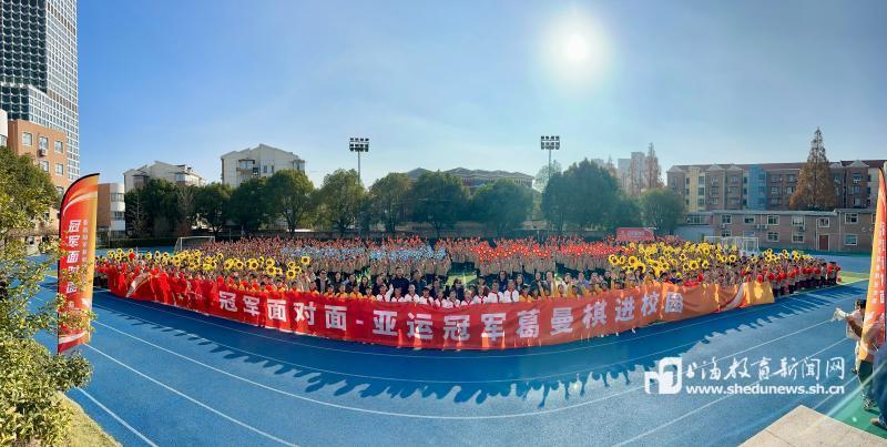 活动当天,阳光洒满校园操场,暖场音乐奏响,葛曼棋身着亮色运动装活力亮相,利落的造型瞬间点燃全场氛围。同学们挥舞着手绘加油牌,高喊 “冠军姐姐”,稚嫩的脸庞上满是崇拜与期待。