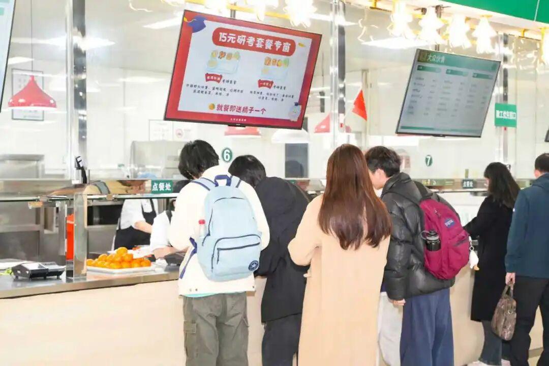 上海立信会计金融学院为研考学子提供就餐便利,推出专属套餐,同时供应暖心红枣茶和橘子,以美好寓意为考生加油打气。