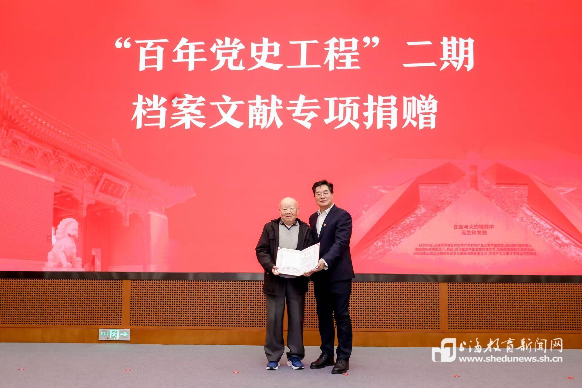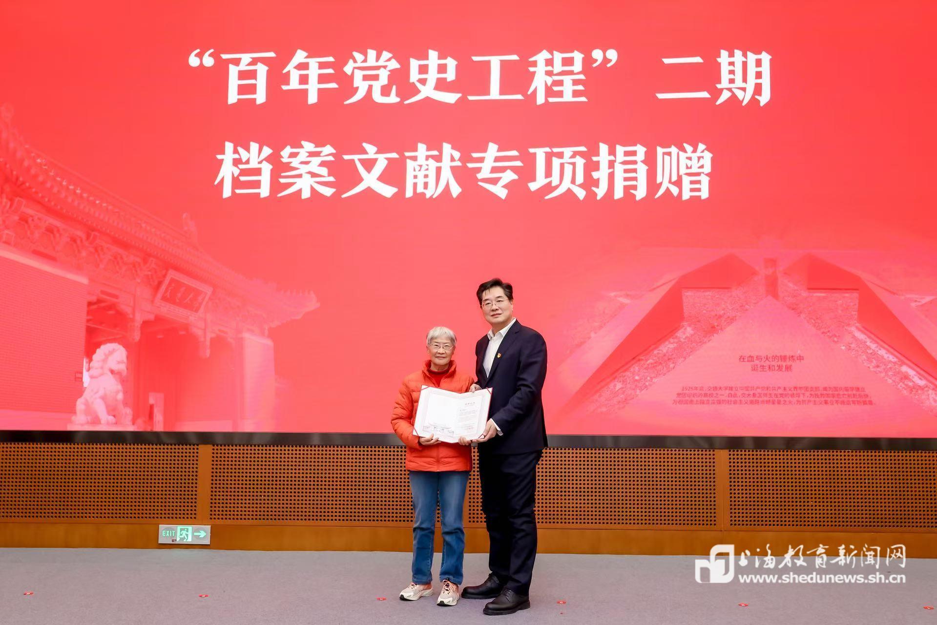在“百年党史工程”二期档案文献专项捐赠环节,交通大学首任党委书记李培南同志的女儿李小苏女士,向学校捐赠了其父担任交大党委书记期间的工作笔记;张永和同志的后辈亲属张元琦女士捐赠了张永和与陆定一同志的往来书信。这些珍贵史料将进一步丰富学校的红色珍档馆藏,为党史研究提供坚实支撑。在陆定一教育基金捐赠签约环节,为缅怀我国宣传思想战线和教育部门的卓越领导人、交通大学第一任团支部书记陆定一同志,其女儿陆瑞君女士捐资设立“陆定一教育基金”。该基金将用于支持学校教育事业,激励后学,为传承红色基因、培育时代新人注入新的动能。