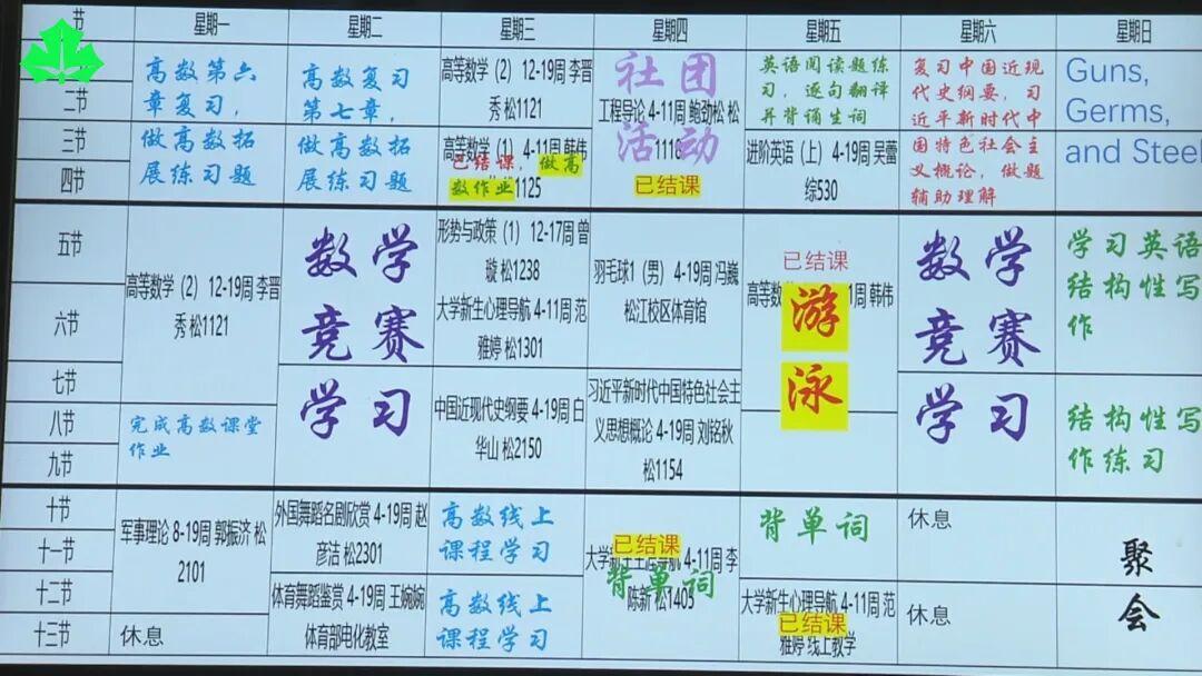 除了学习形式有所变化,从一周计划安排表可以看到,教室上课的时间只占到任嘉勋周一至周五时间的一半。这也让他能有更多的时间去巩固所学知识,丰富大一的学习生活。