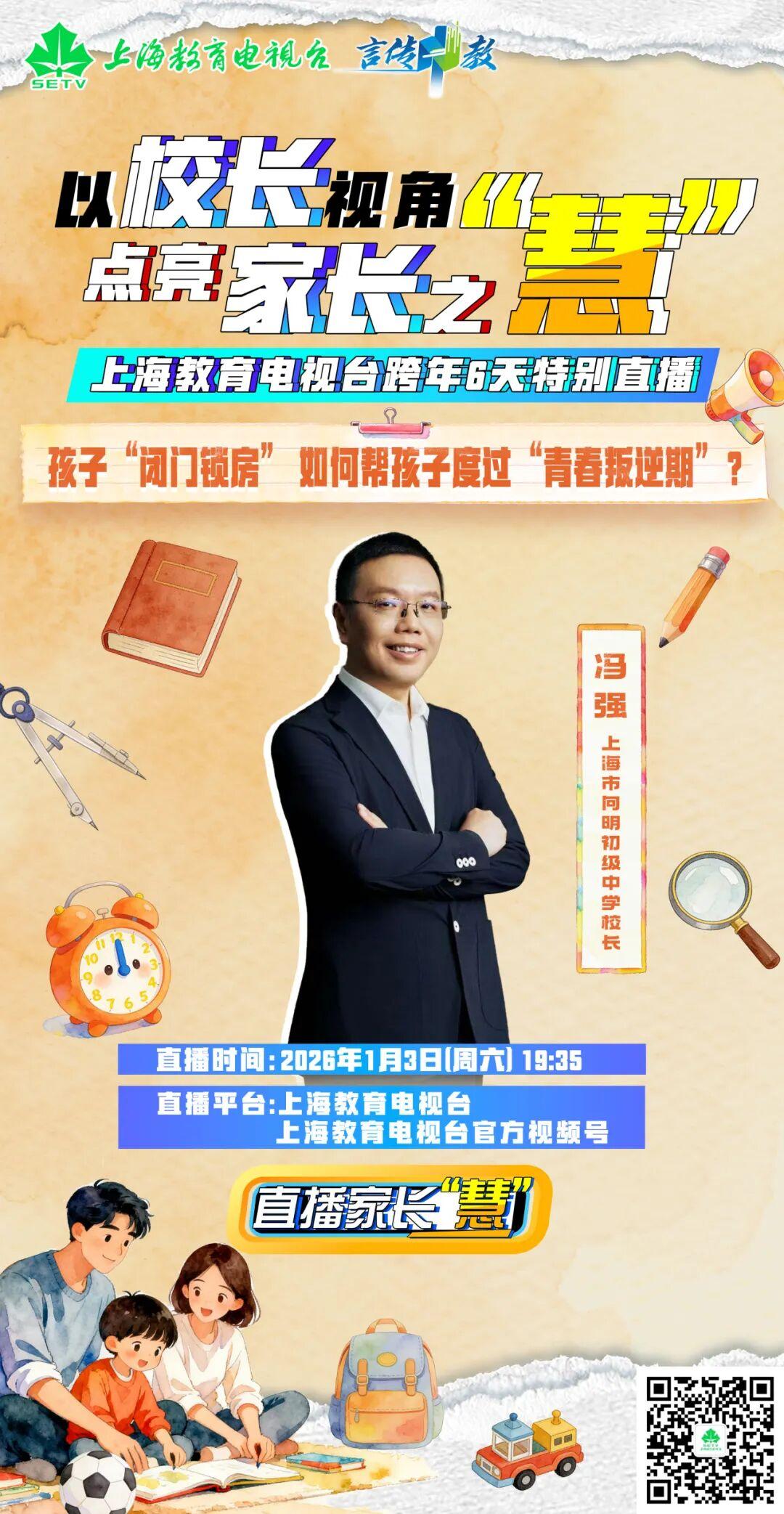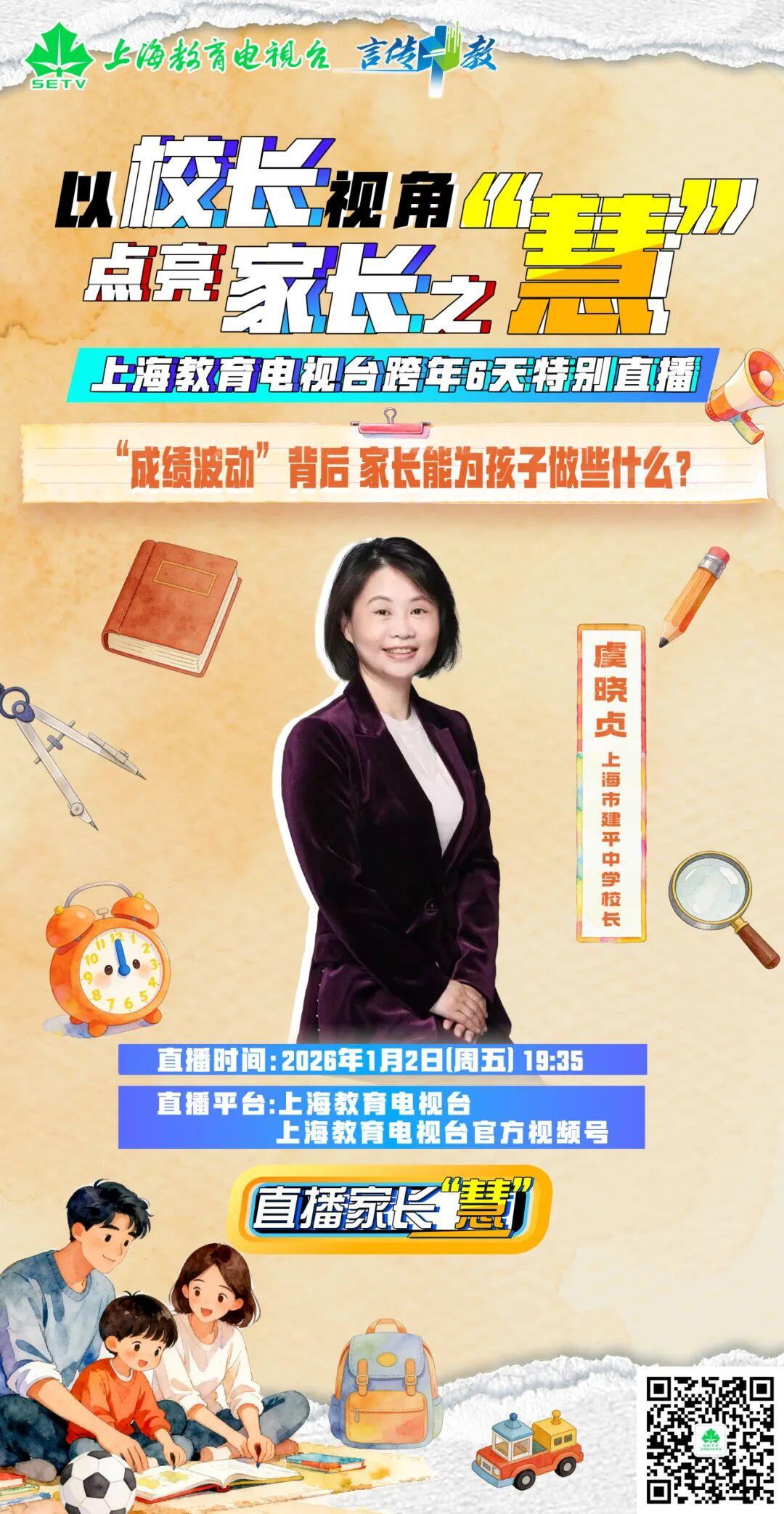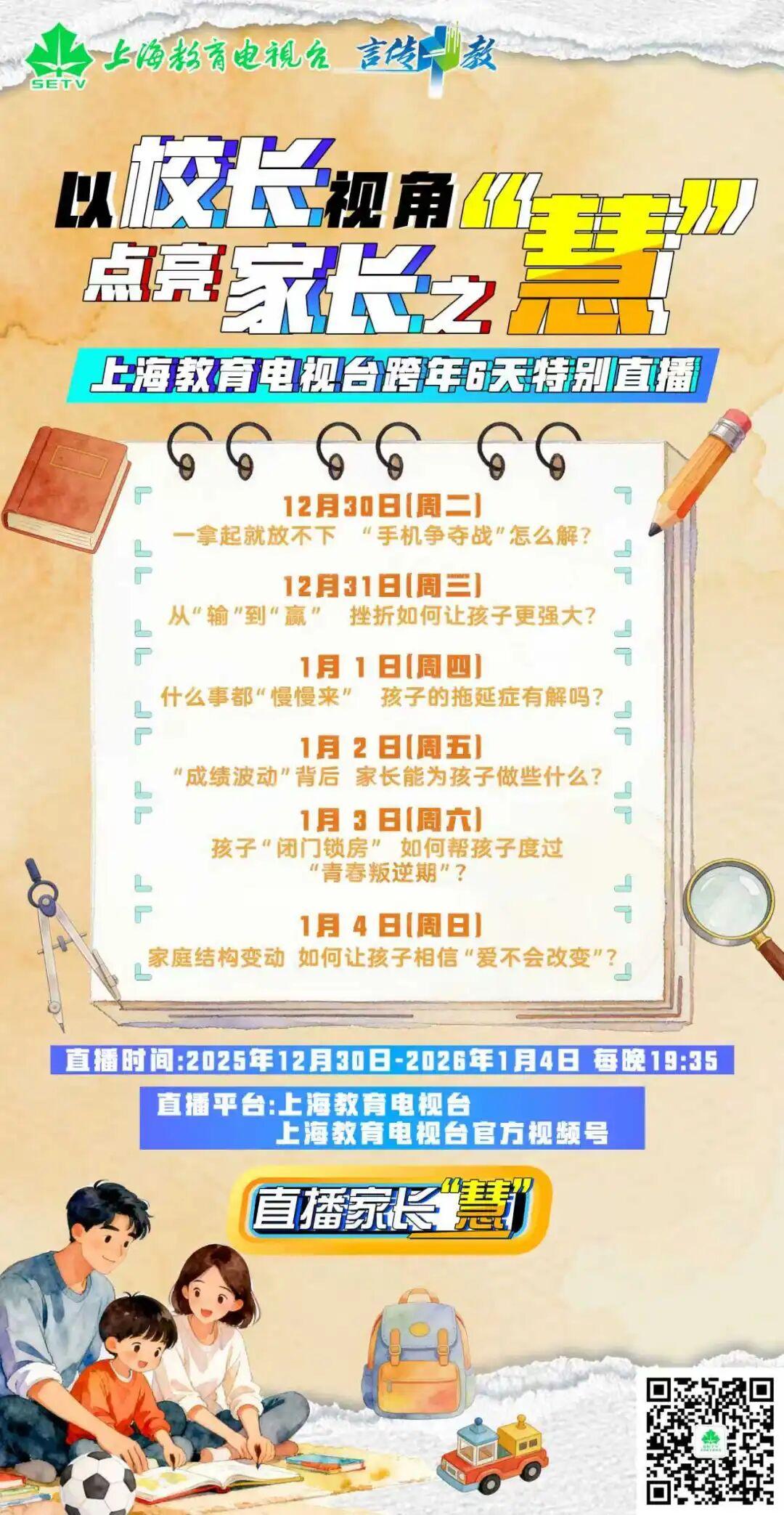 2025年12月30日至2026年1月4日,上海教育电视台家庭教育栏目《直播家长“慧”》再度推出跨年特别直播节目。连续六天,每晚19:35黄金时段,沪上6位知名中小学校长将坐镇直播间,与市教科院王枫老师一起,针对当下家长最关切的育儿难题,深入剖析根源、提供应对策略、给予专业支持,助力构建和谐亲子关系。