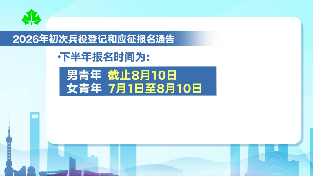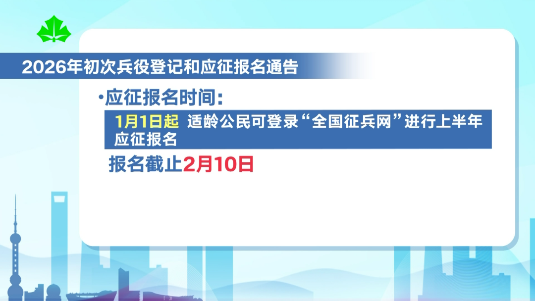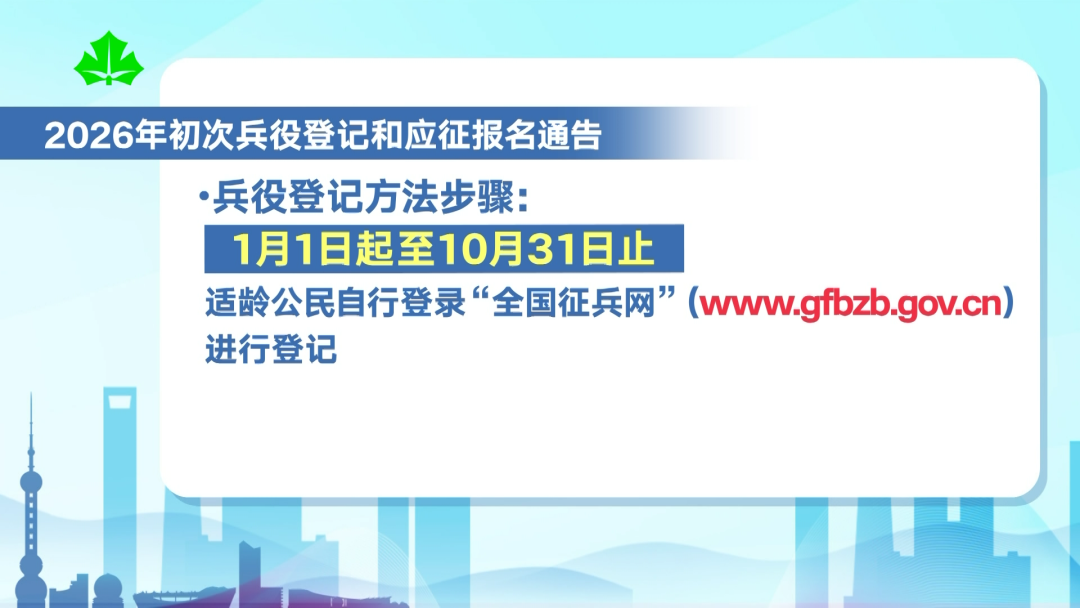 日前,上海市政府征兵办根据《中华人民共和国兵役法》《征兵工作条例》《兵役登记工作规定》,发布2026年本市范围内适龄公民初次兵役登记和应征报名有关事项的通告。