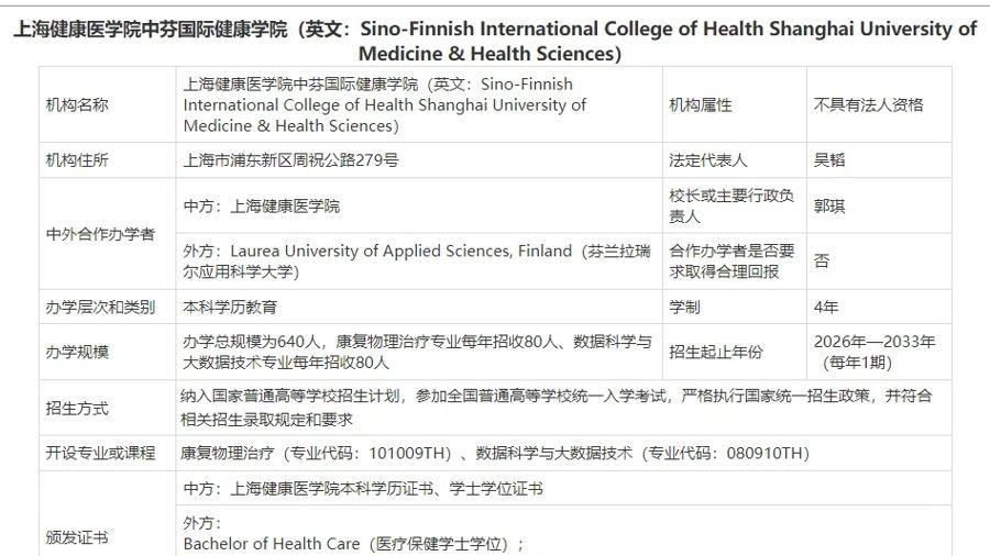 记者从上海健康医学院获悉,上海健康医学院中芬国际健康学院已获批,由上海健康医学院与芬兰拉瑞尔应用科学大学合作成立,将于今年启动首届招生。