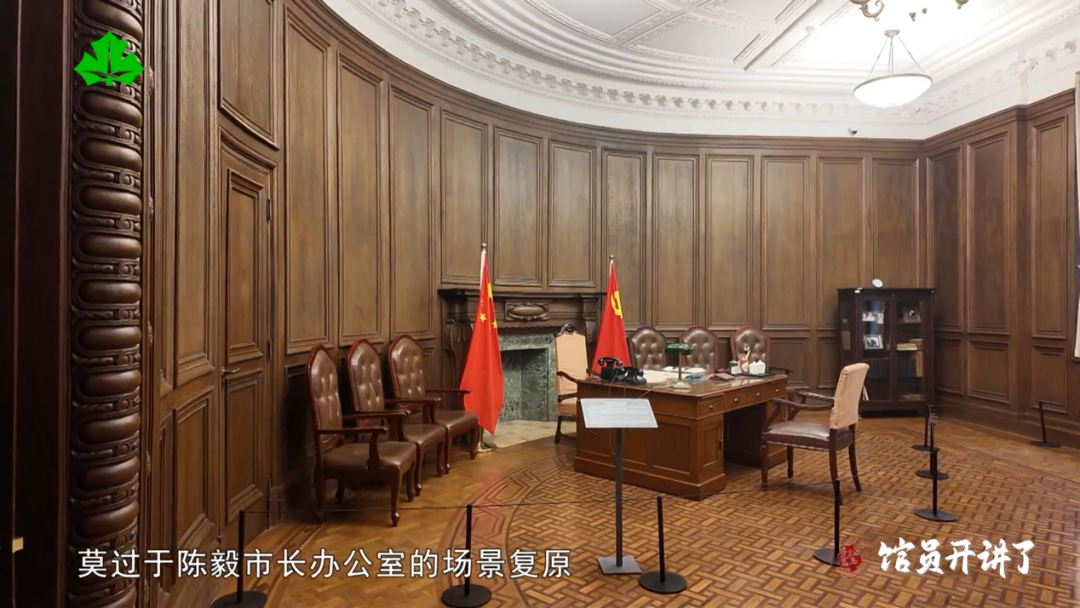 展览复原了陈毅市长办公室的场景,办公室中,陈毅市长当年使用过的双面书桌和书柜都保留着历史的印记。