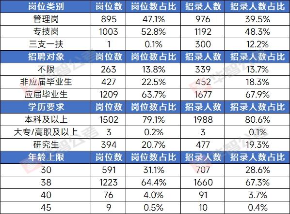 在今年招录的1899个岗位中,以工程师、财务会计和卫生保健员等为代表的专技岗居多,招录人数为1192人,占总人数约52.8%,同比减少13%。党务、人事、行政等管理岗共招976人(不含“三支一扶”岗位),约占总人数的39.2%,相较去年的1200人,缩减幅度近20%。此外,“三支一扶”岗位共计招录300人,相较去年小幅缩招。