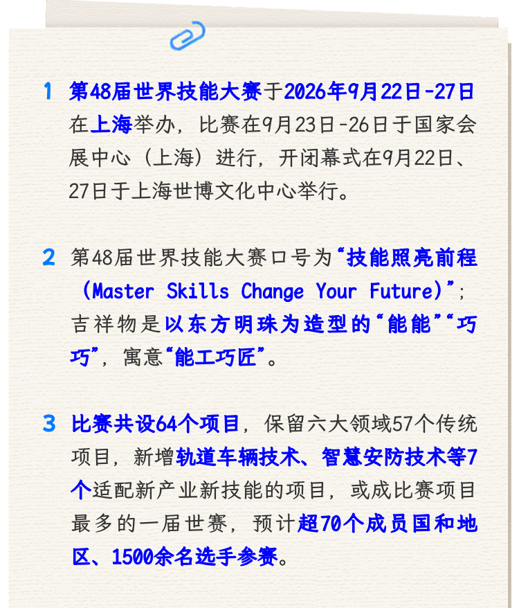 市人社局介绍,2月2日-5日,第48届世界技能大赛准备周会议在上海召开。准备周会议是世界技能大赛举办前的固定活动。对于第48届世界技能大赛你了解多少?大赛在何时何地举办?有多少比赛项目?一起来看——