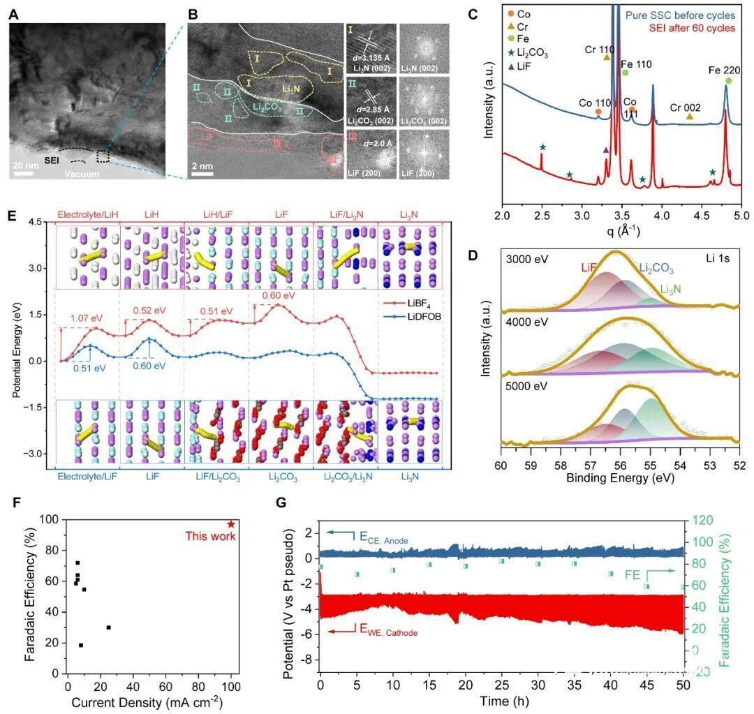 成功构建了去溶剂化-扩散层状架构(DDLA)的SEI后,研究团队通过冷冻透射电镜结合同步辐射表征技术,解析三层精密离子通道结构,首次确立“去溶剂化-传输-催化”级联调控新机制。这些发现不仅揭示了电极-电解质界面离子传输的级联调控机制,其分级离子传输机制也为设计下一代高效合成氨电极提供了明确的界面工程原则。