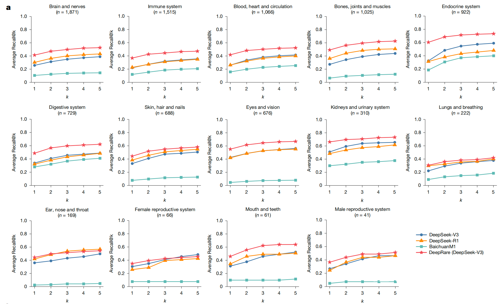 DeepRare还展现了极具弹性的临床诊断能力,尤其在纯表型诊断上取得了颠覆性突破。论文数据显示,在仅提供患者临床表型信息而不包含基因数据的情况下,DeepRare展现出了惊人的“表型解码”能力。其表型诊断的首位准确率(Recall@1)达到 57.18%。这一数据具有里程碑意义——它比此前该领域的国际最佳模型提升了23.79个百分点,彻底改变了过去“不测基因就难确诊”的困境,为基层医院的快速筛查提供了强有力的工具。在回顾性人机对比实验中,DeepRare在诊断召回率上超越了具有十年临床经验的罕见病专科医生,成为首个在该指标上优于医生的罕见病诊断方法。