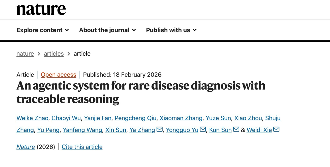 本网讯(记者 程媛媛)北京时间2月19日凌晨,国际顶级学术期刊《自然》(Nature)在线发表了上海交通大学人工智能学院与医学院附属新华医院联合团队的重磅成果——“An agentic system for rare disease diagnosis with traceable reasoning”。该研究由上海交通大学人工智能学院张娅教授、谢伟迪副教授与医学院附属新华医院孙锟教授、余永国教授领衔,协同多方科研力量共同攻关完成。