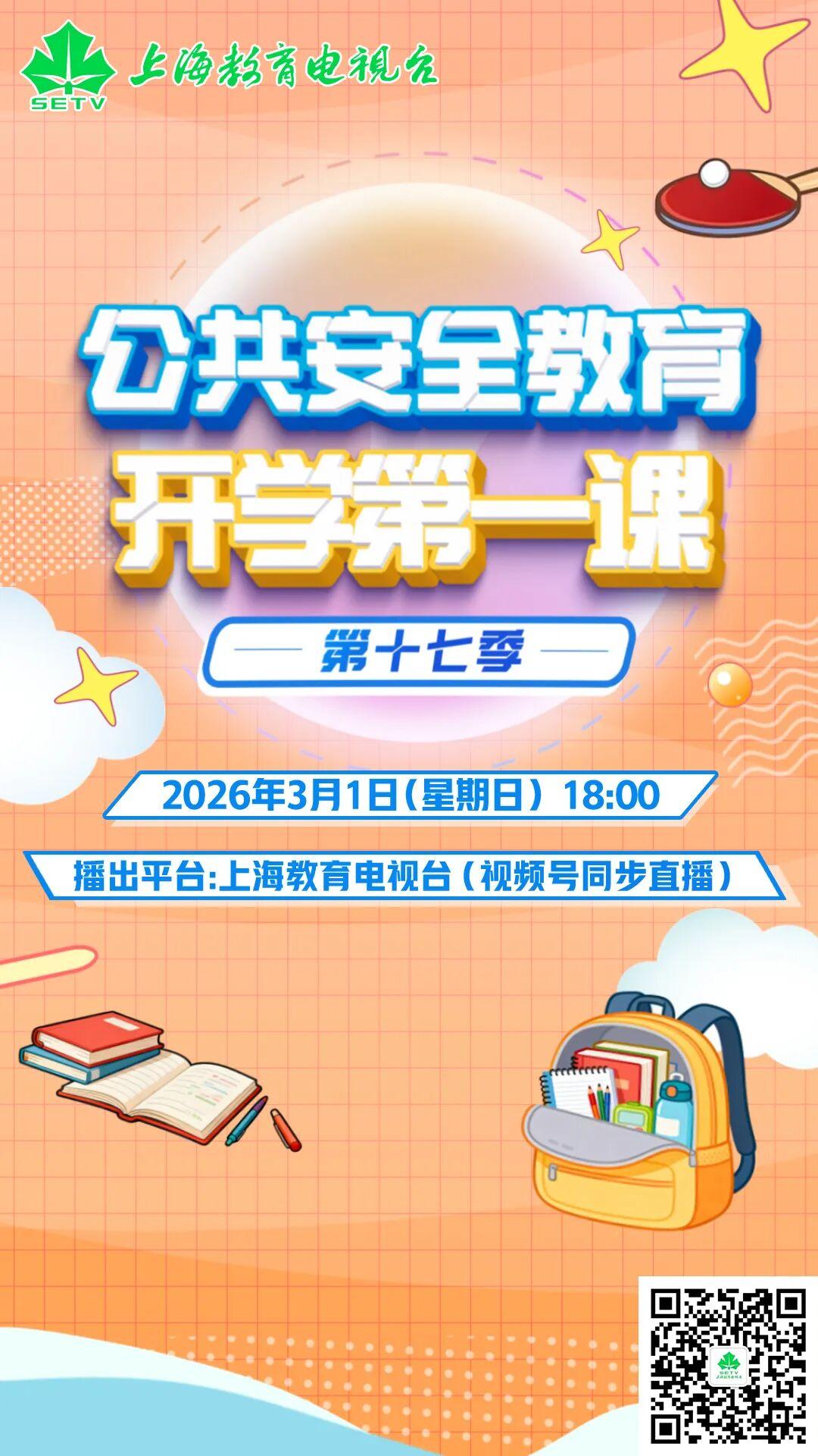 2026年春季学期开学在即,由上海市教育委员会、喀什地区行政公署、上海市对口支援新疆工作前方指挥部、上海市公安局、上海市应急管理局、上海市消防救援局联合主办,中共上海市教育卫生工作委员会新闻中心(上海教育电视台)精心打造的《公共安全教育开学第一课》(第十七季)将于3月1日(星期日)18:00在上海教育电视台播出。