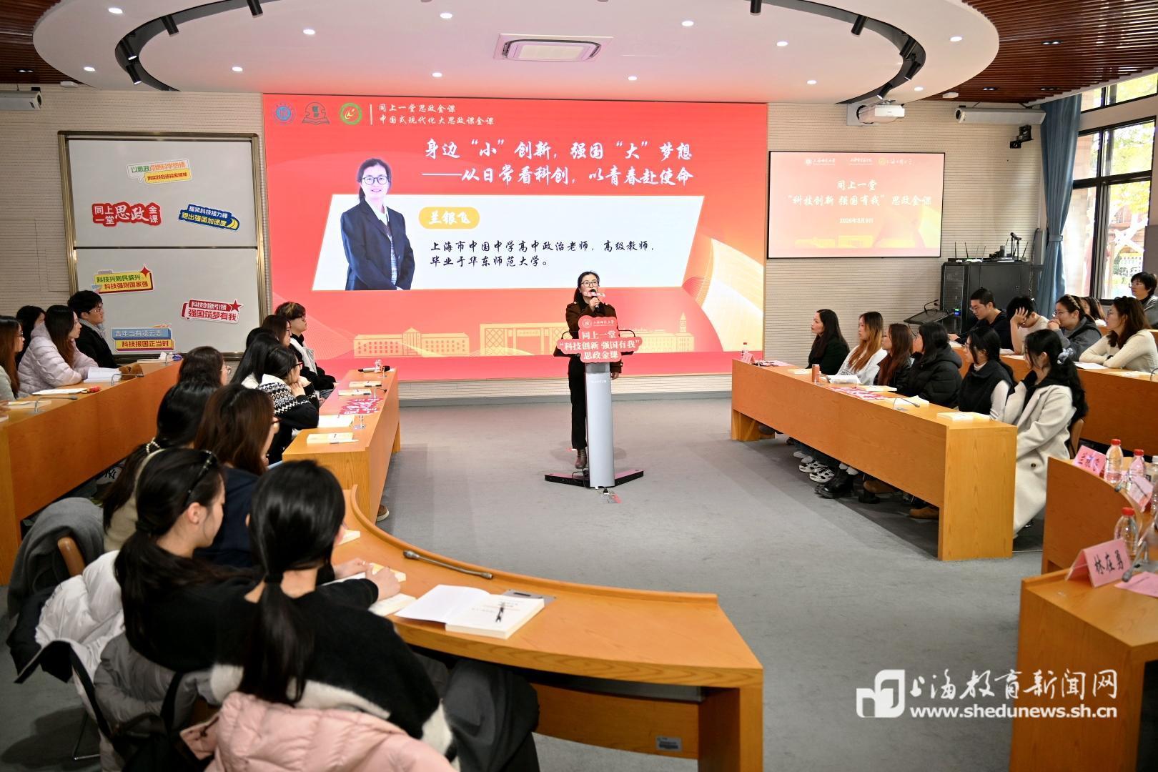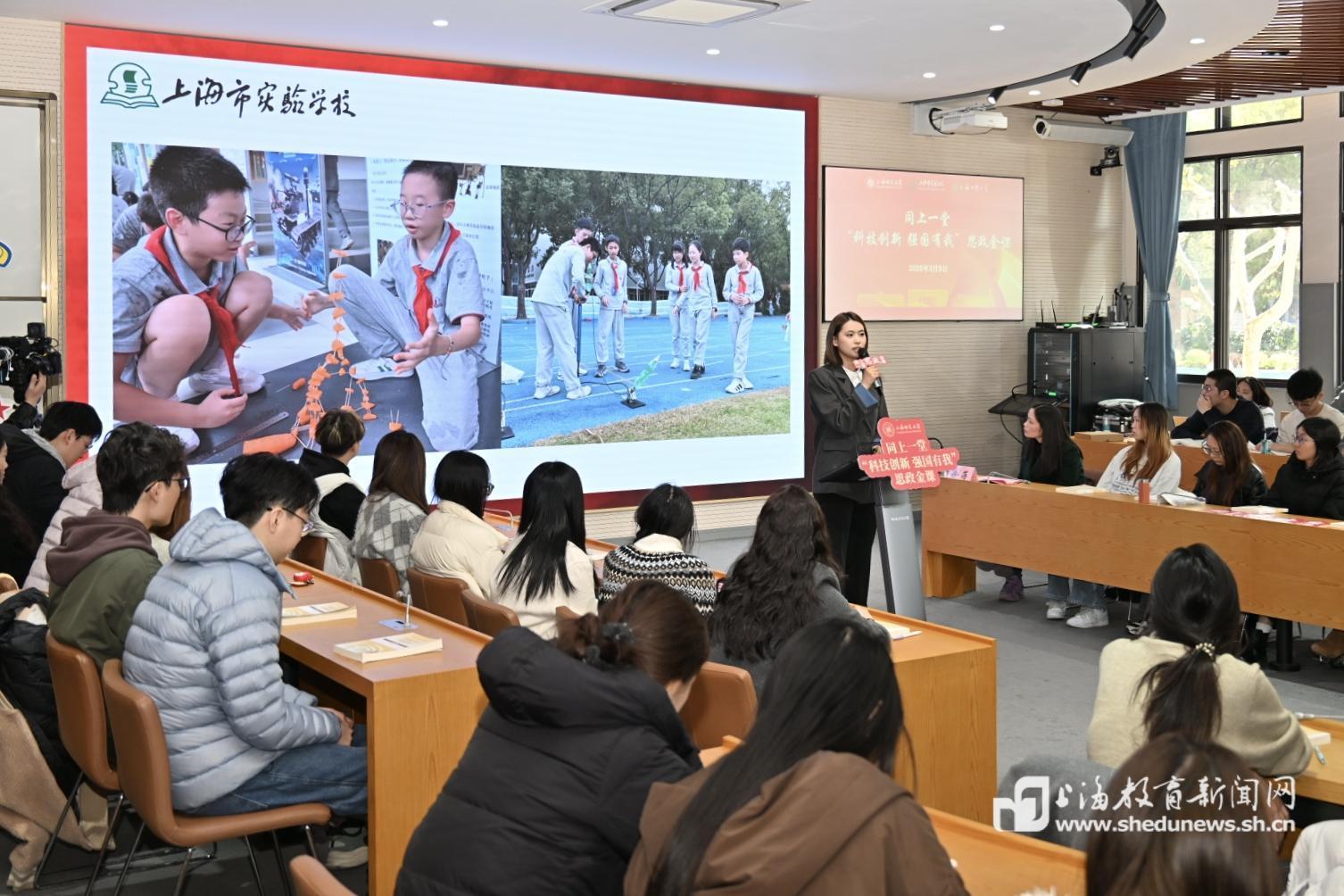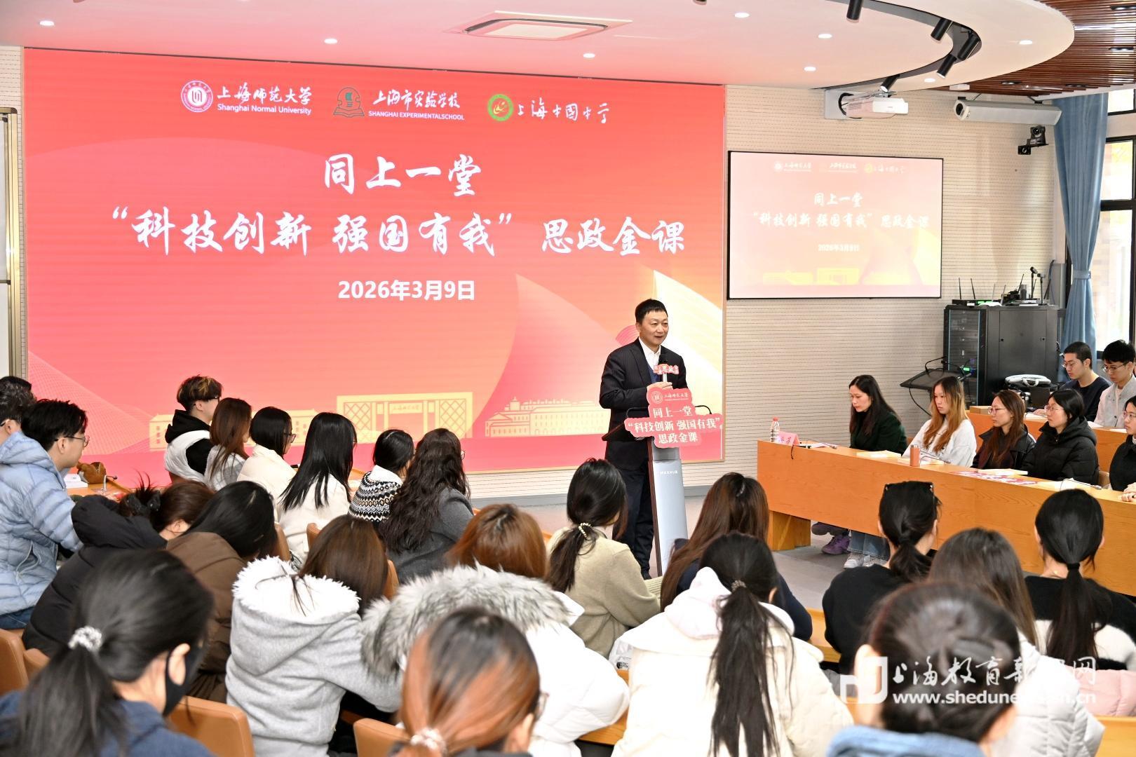 本次思政课以上海师范大学为主课堂,联动上海市实验学校和上海市中国中学,采用现场授课和网络直播的线上线下相结合的形式,面向大中小学生同上一堂思政课,既有理论解读,有实践阐释,又有启发式师生互动。师生们一同探寻科技创新的时代密码,引导学生深刻理解科技强国这一国家战略的深刻内涵,明晰新时代青少年的使命担当。