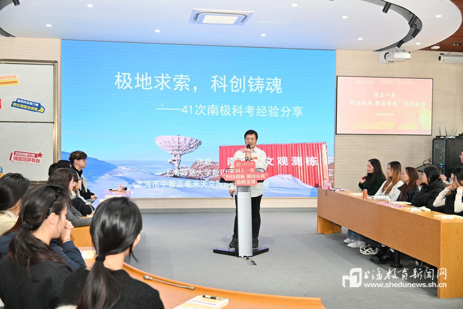 3月9日上午,一场别开生面的大中小学“同上一堂思政课”在上海师范大学徐汇校区举行。上海师范大学党委书记林在勇,中国第41次南极考察队队员、上海师范大学数理学院教授张毅,马克思主义学院思政教师徐蓓,上海市实验学校道法课教师胡尔姝,上海市中国中学高中政治课教师兰银飞围绕“科技创新 强国有我 为实现高水平科技自立自强贡献青春力量”主题,共同为大中小学生授课。