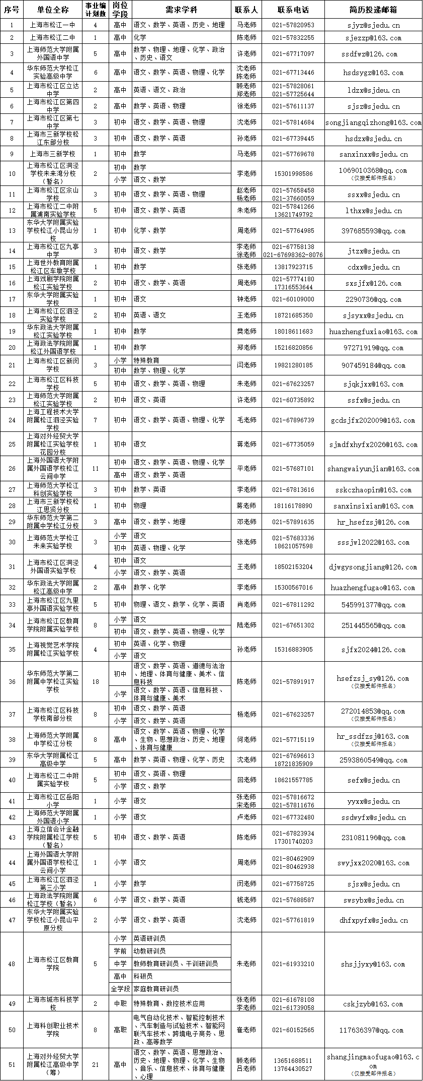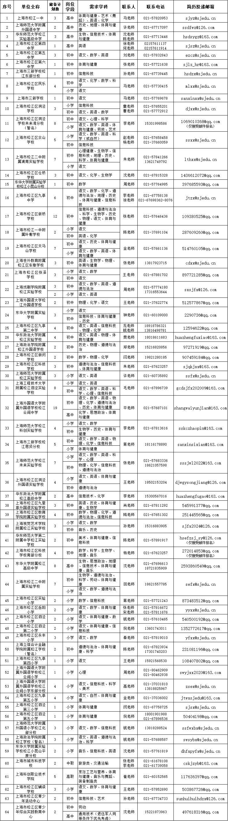 上海市松江区部分公办学校事业编和储备教师。具体需求类型、岗位名称及招聘计划数等信息见附件。
