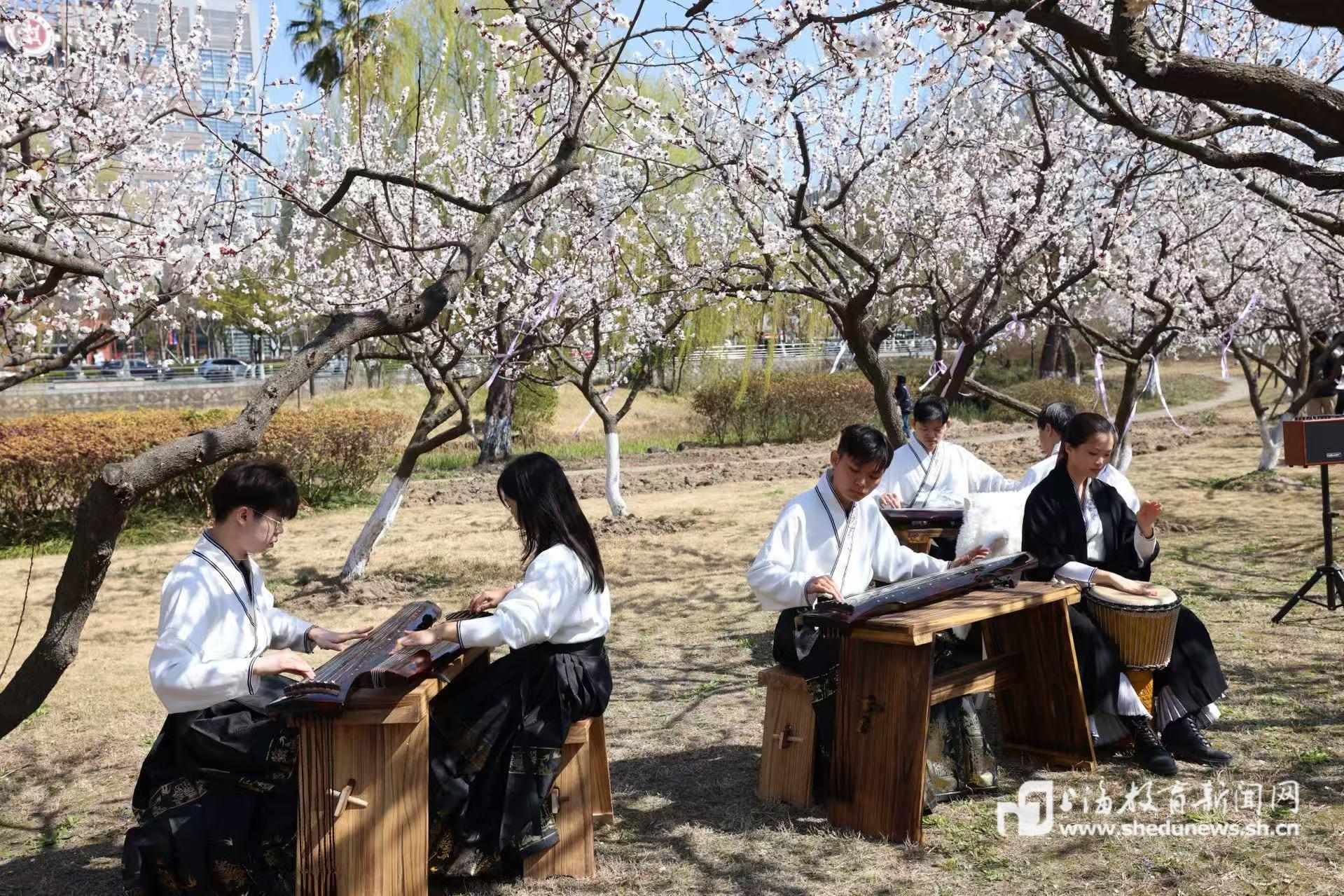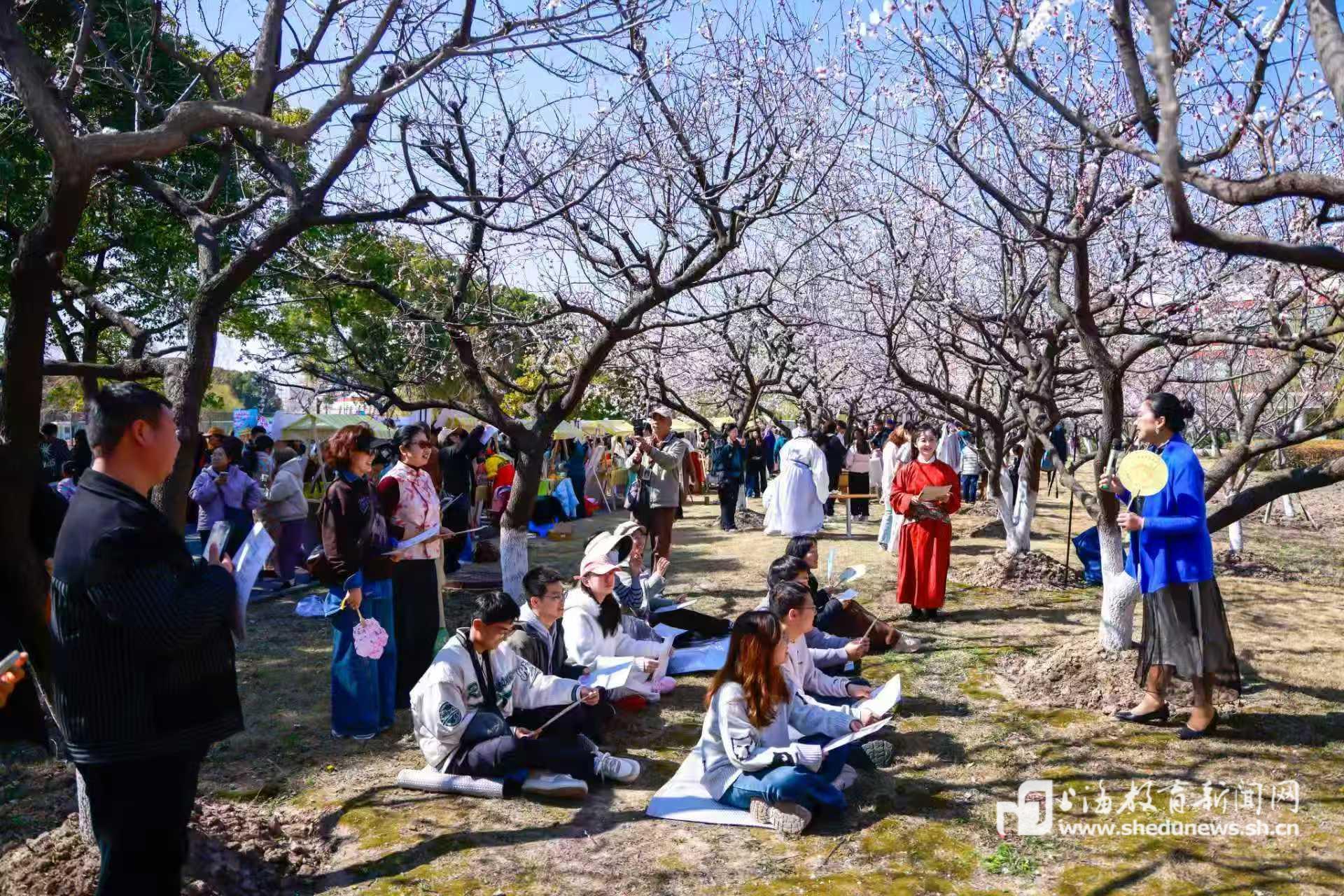 走进杏林,每一朵花都成了育人的载体。在杏花掩映下,科技人文研究院的张苇航老师正给学生上着一堂“吟诗赏花说医药”微课。她将“杏林”的医者仁心、“杏苑”的学术追求与“杏坛”的师道传承娓娓道来,寄语学子在躬身求学中树立文化自信,领悟天人合一之境和传统文化之美。来自东南亚、北美等地区的留学生一起,在落英缤纷中“搭台弹琴”,还配了非洲鼓、小磬等配器和鸣,引来众多游客驻足聆听。