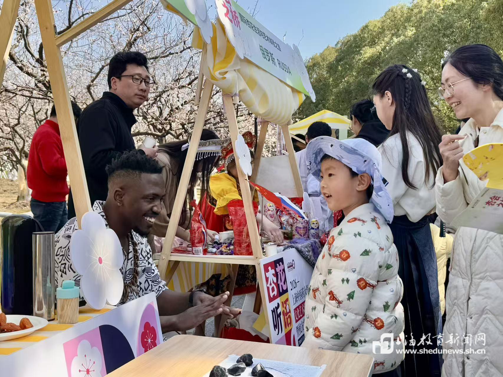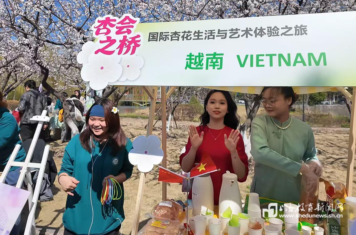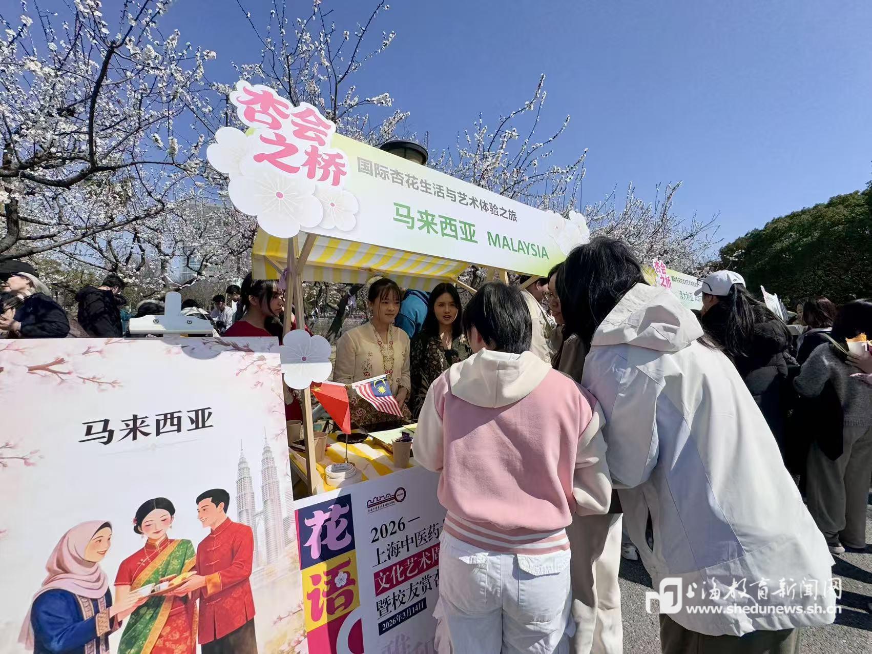 “杏会之桥”国际杏花生活与艺术体验之旅在一曲轻快的笛子独奏中开启!200多名国际学生穿梭其中,来自11个国家的留学生身着各自国家民族服饰,展示本国杏花元素与健康理念。俄罗斯姑娘安娜热情地招呼大家品尝巧克力与果汁,马来西亚姑娘陈瑀薰身着融合了牡丹刺绣与蜡染的娘惹服装,带来了椰子饼等传统美食。手工互动体验区成为跨文化交流的实践场所,以“指尖上的文明互鉴”为设计理念,轮流展演杏花茶引、杏仁点心、杏味香囊等药食同源技艺,并现场教做杏花书签、杏花香扇,把上中医的春天名片递向世界。