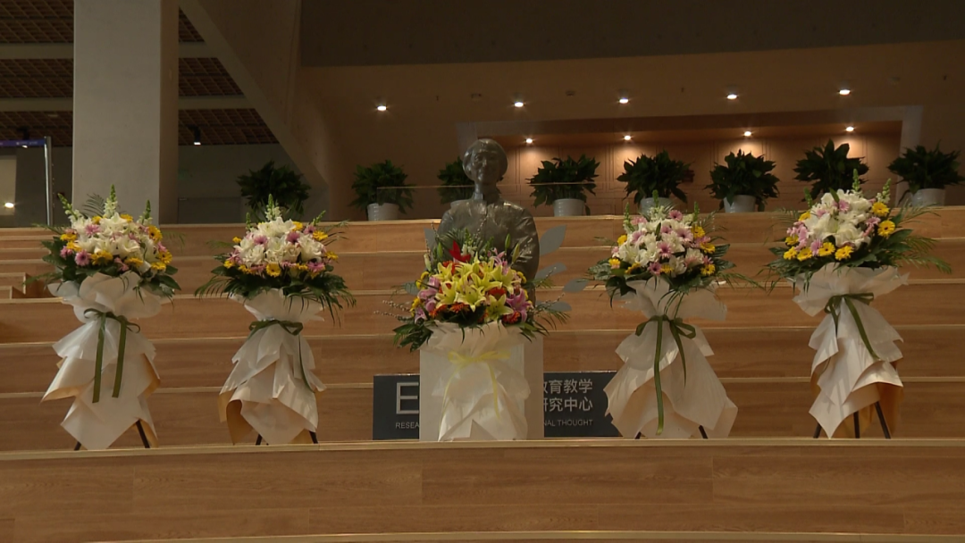 走进于漪教育教学思想研究中心一楼大厅,于漪先生的雕塑庄重而肃穆。雕塑前,鲜花簇拥,一朵朵、一束束,承载着人们深深的敬意与无尽的思念。大家缓缓走近,轻轻献上手中的鲜花,眼神中满是崇敬与缅怀。