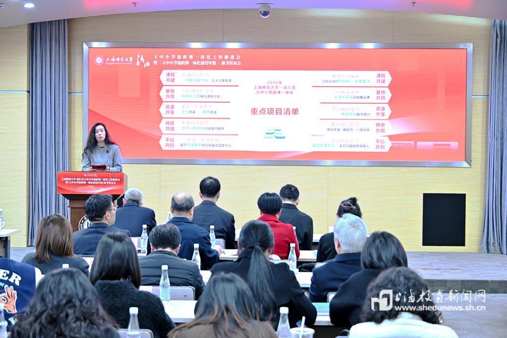 会上发布了2026年上海师范大学-徐汇区大中小学思政课一体化工作清单,明确未来的10项重点任务:一是共同开发“中国式现代化”五大主题思政金课;二是联合编制并动态修订《徐汇区大中小学思政课一体化教学指导意见》,立标定向教学目标衔接要求;三是馆校合作建立标准化工具,规范课程开发;四是打造15分钟实践圈,重点打造上海师大学区实践圈品牌;五是创设文脉+思政场景,打通文化资源与教育资源;六是跨段教研接力,打通相邻学段教学壁垒;七是持续开展“先锋班”骨干培育,着力培养各学段50名骨干教师;八是打造联合教研中心,形成高校专家+教研员+一线名师人才队伍;九是“汇地图”优化升级,构建基于思政素养的五育融合实践平台;十是打造资源联动平台,融合校家社企,全方位赋能思政育人。