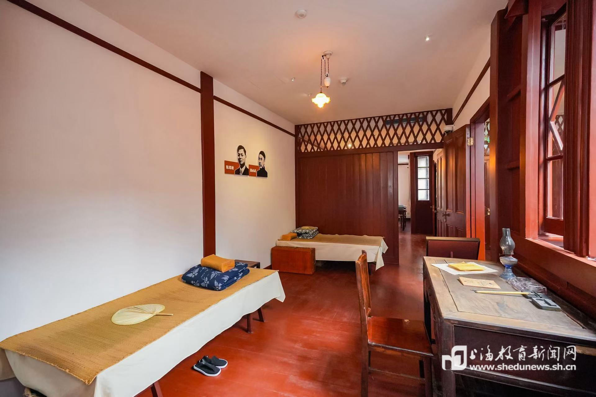 在建筑二楼代表住宿与活动区域,馆方以历史文献、老照片、中共一大代表及曾在博文女校居住人员的口述史料为支撑,对代表们的住宿房间进行了明确标识:毛泽东与何叔衡同住二楼西厢房当中一间;董必武与陈潭秋居于东厢房当中一间;王尽美、邓恩铭住在西厢房沿街小间。结合各位代表的性格特征、生活习惯及建筑原有空间布局,展陈进一步丰富了场景布置元素。例如,在董必武住宿房间放置落地衣架,并按照他的衣着习惯挂上一件长衫。桌椅、书籍、信件、皮箱、洗脸架、报刊架、蒲扇等物品的增添,让观众能直观感受代表们当年居住、思考和交流的实景。