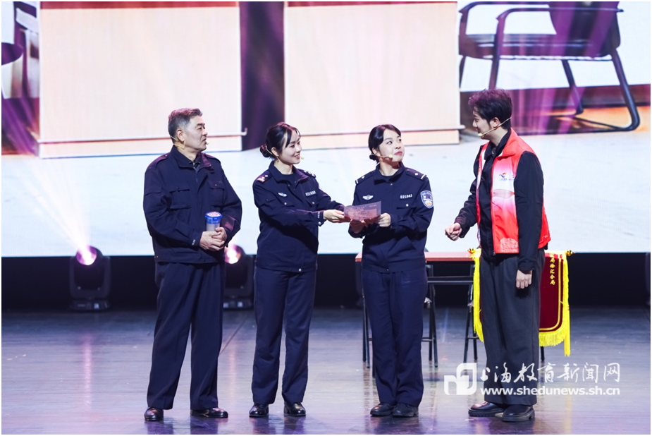 情景剧《大王小王和老王》则将视角转向徐汇公安系统内的200多名退役军人。通过对话巧妙串联起在市公安局徐汇分局国家二级英模工作室——“王瑞芳新警带教工作室”里,年轻聪慧的“小王”、温柔坚韧的“大王”和经验丰富的“老王”三位社区民警的故事。他们中有的是反诈先锋、守护群众“钱袋子”;有的是孤寡老人的“亲人”,用法律和温情撑起保护伞;有的用二十年如一日的坚守,将曾经的“刺头”感化为社区志愿者,将 “问题小区”打造成“平安福地”。三代传承的故事生动诠释了退役军人干警“为了人民”的初心与坚守。