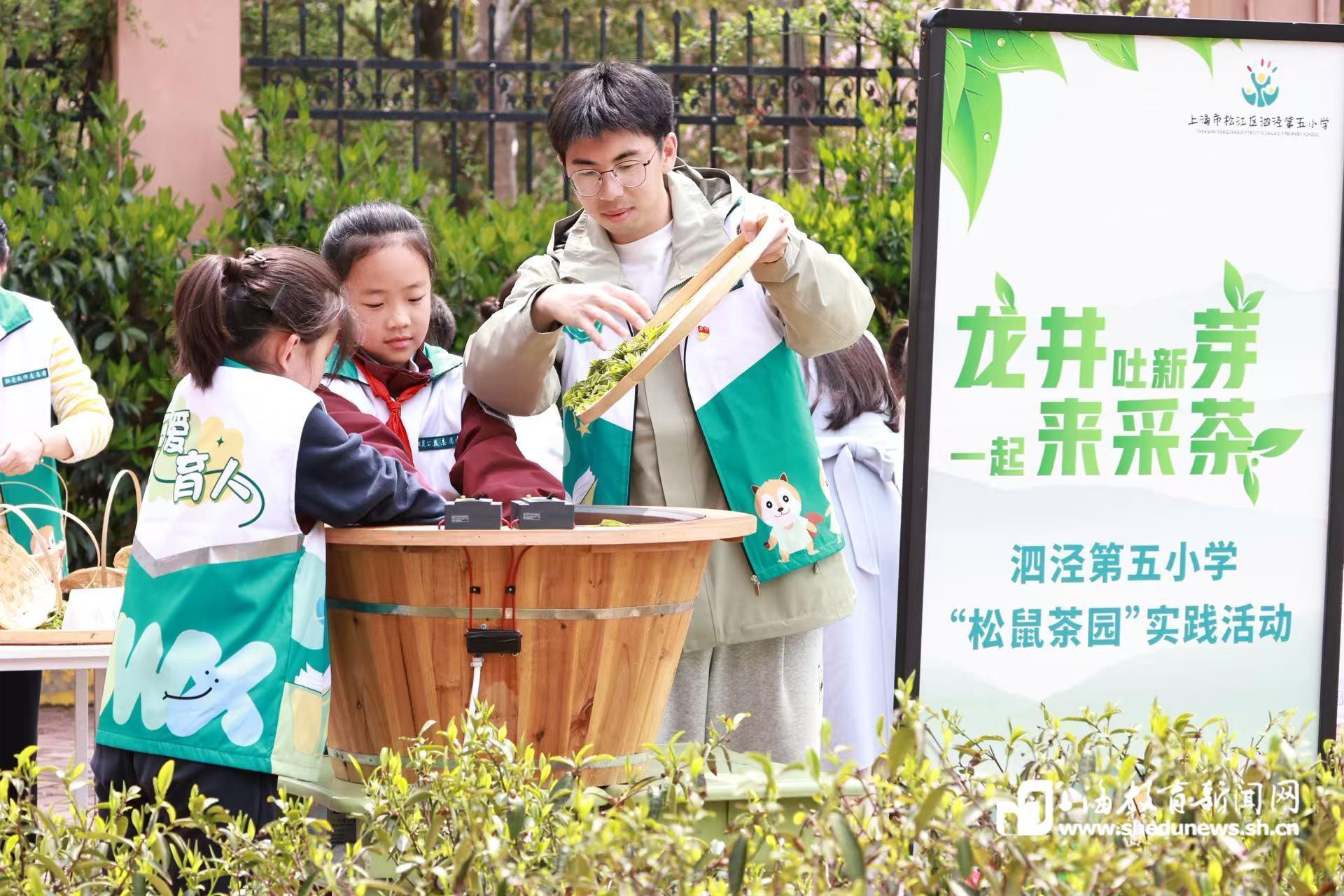 春茶吐绿,清香满园。4月1日,在松江区泗泾五小380平方米的“松鼠茶园”里,学生们正忙着采摘、炒茶、做茶点。这不仅是春日里一次充满趣味的课外实践,更是学校“仁爱育人”教育理念和“5A”课程体系的生动缩影。从一片小小的茶园出发,可以窥见这所建校仅七年多的年轻学校,如何将劳动教育、文化传承、科技赋能紧密结合,走出一条特色鲜明的育人之路。