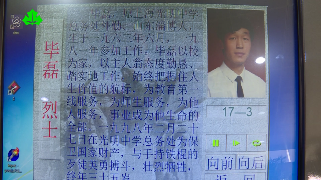 同样的红色基因,也流淌在另一位光明中学英烈校友毕磊的身上。毕磊,1963年出生于山东淄博一个普通工人家庭,1981年受聘于他热爱的母校——光明中学。1998年2月27日,他在学校财务室值班期间,为保卫国家财产与手持铁棍的歹徒殊死搏斗,壮烈牺牲,终年35岁,安葬于上海龙华烈士陵园。