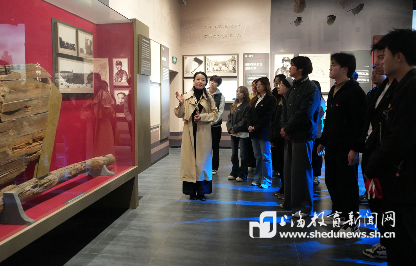 作为“浦东的延安”,红色泥城不仅打响了浦东抗日的第一枪,更是浦东抗日武装秘密集结、南渡浙东开辟抗日根据地的起点。在姜文光南渡浙东时乘坐的木船船舵前,上海电机学院马克思主义学院教师刘妤,详细讲述了浦东抗日武装从泥城出发、奔赴浙东抗日战场的壮阔历程,并寄语青年学子:“缅怀先烈,更要铭记历史;回望征程,更要勇担使命,把革命精神转化为奋进新时代的强大动力。”