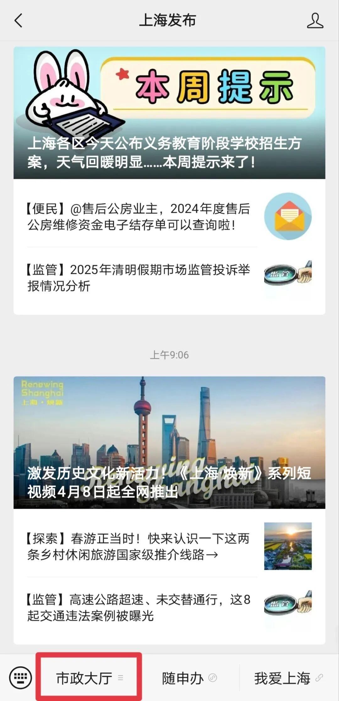 1、首先,搜索“上海发布”(微信号:shanghaifabu)并点击关注!点击页面下方“市政大厅”进入。