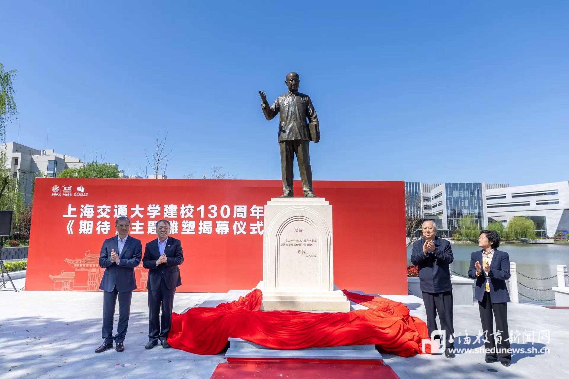 于百卅校庆之际落成的钱学森主题雕塑《期待》为青铜材质全身立像,以钱学森晚年经典形象为蓝本,身姿挺拔,目光深邃,基座正面镌刻钱学森对母校的寄语“在二十一世纪,努力把上海交通大学建设成世界一流大学”,精准还原钱学森作为交大学子与母校的深厚情谊、对交大后辈的殷殷期待以及作为共和国脊梁的卓越风骨。雕塑位于宣怀大道与学森路交界处,与上海交通大学闵行校区东大门处的盛宣怀像遥望呼应,是对盛宣怀当年建校目标的最好回应,更昭示上海交通大学迈上立足强国建设、民族复兴新征程,扎实推进教育科技人才一体化的全新起点。