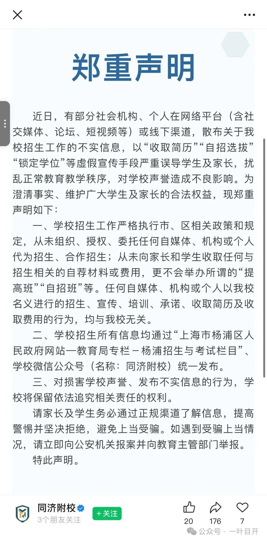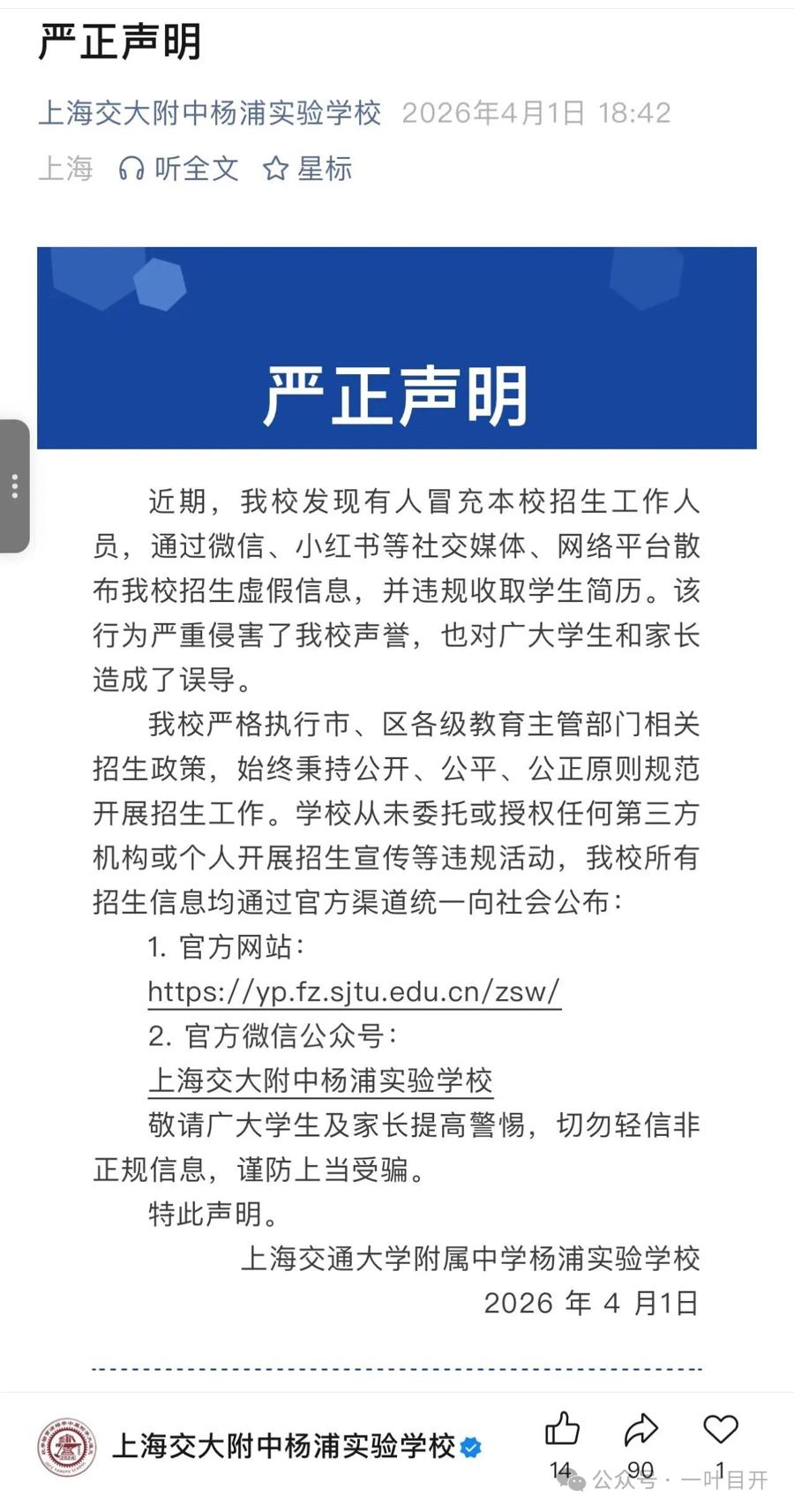 值得关注的是,上周,上海交通大学附属中学杨浦实验学校、上海杨浦双语学校、同济大学附属新江湾城实验学校等纷纷发布声明,辟谣提前招生、内部选拔、收取简历等不实信息,强调将严格遵守阳光招生政策。