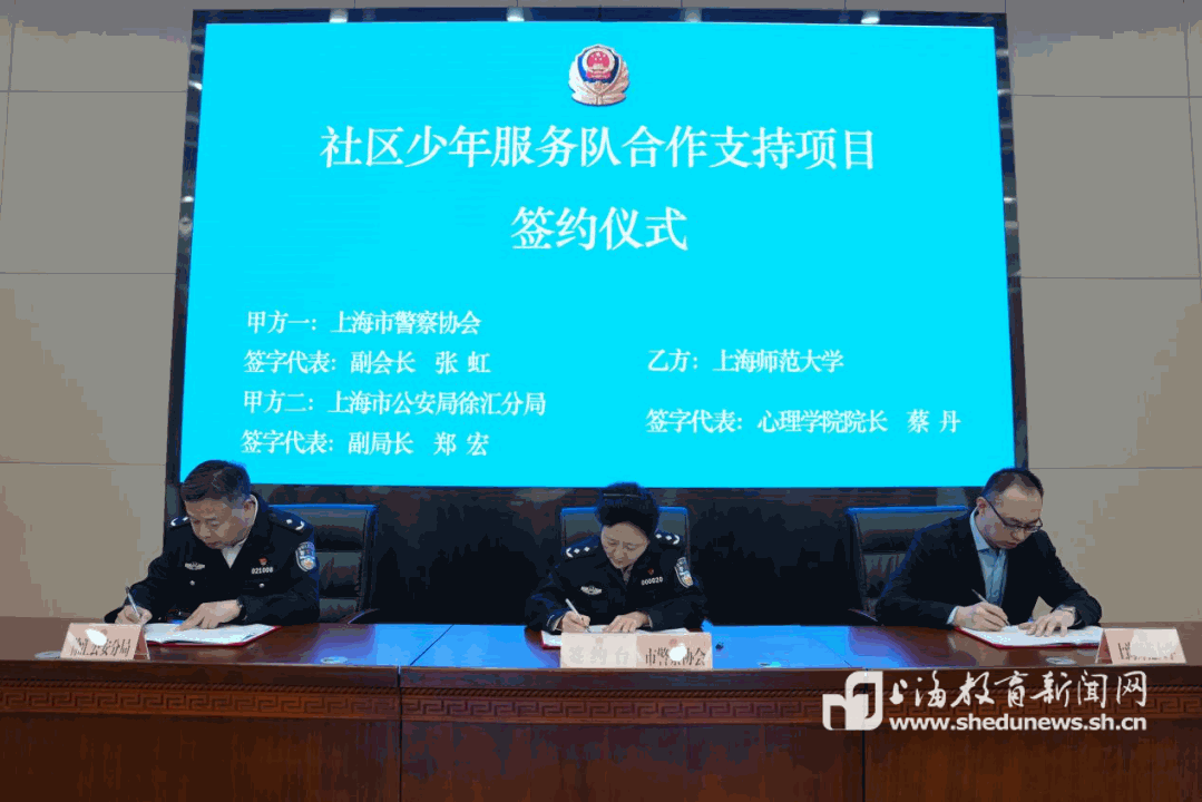 为更好地促进儿童青少年心理健康发展,助力构建具有上海特色的青少年关爱保护体系。4月8日,上海市警察协会、上海师范大学与上海市公安局徐汇分局联合举行社区少年服务队合作支持项目签约仪式。上海市警察协会会长蔡田,上海师大党委副书记、副校长赵扬,徐汇区副区长、市公安局徐汇分局党委书记、局长吴捷出席仪式。