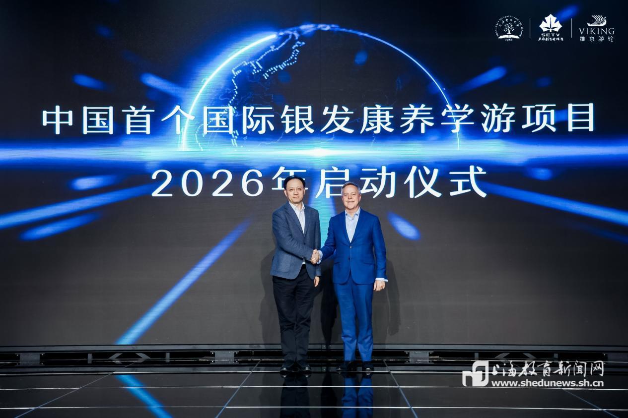 上海开放大学党委副书记、校长贾炜,维京游轮中国区董事总经理唐博文(Brendan Tansey)共同启动2026年国际康养学游项目