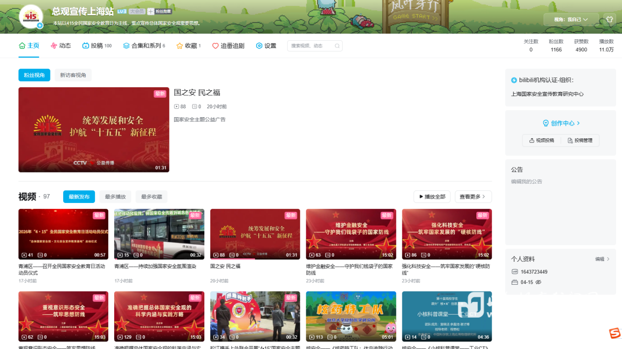深耕新媒体宣传阵地,打造优质宣教载体。上海开放大学通过官网、官微和户外电子屏等多种载体,深入宣传总体国家安全观和国家安全相关内容。同时,上海国家安全宣传教育研究中心聚焦B站、澎湃新闻两大主流新媒体平台,依托“总观宣传上海站”官方账号,近期持续推送系列优质宣教内容,累计发布稿件50余条,总点击量达49万次,有效扩大了国家安全教育的覆盖面和影响力,让总体国家安全观更加深入人心。研究中心还与上海市法学会国家安全法律研究会深度合作,邀请国家安全领域权威专家录制专题视频4个,目前正陆续在B站、澎湃新闻、上海学习网、一网通学、上海教育资源中心、上海老年大学订阅号、上海家长学校微信公众号、上海开放大学学生之家微信公众号等多个平台上线,进一步丰富了国家安全教育的传播形式,实现多渠道传播、全方位覆盖。