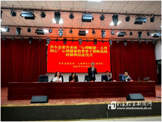4月10日,本次心理健康援疆培训项目结业仪式在莎车县举行,莎车县、泽普县、叶城县、巴楚县等四县参训教师通过“线上+线下”相结合的方式同步参与,实现培训成果全员共享。心理学院党委副书记、院长蔡丹,闵行区教育学院副院长贾永春(线上参会),莎车县教育局党组副书记、局长麦麦提吐尔孙•麦合木提等领导嘉宾出席仪式,共同总结培训成效、部署后续工作。