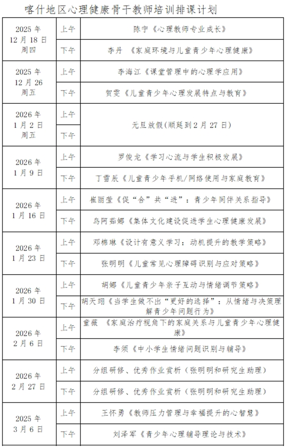 从线上云端的精准对接,到线下一线的沉浸式研修;从集中培训的知识赋能,到长效反馈的跟踪提升,本次援疆培训不仅为喀什地区四县心理健康教育骨干教师筑牢了能力根基,更凝聚起两地携手推进教育援疆、守护青少年身心健康的强大合力。这场温暖而有力量的“心”育之旅,既是落实党建引领、深化对口援疆工作的具体实践,更是推动优质教育资源均衡配置、促进民族地区教育事业高质量发展的生动体现。未来,心理学院将持续深化联动、久久为功,让育人“心”灯持续点亮,以专业力量护航民族地区青少年健康成长,以实际行动践行教育援疆使命担当。