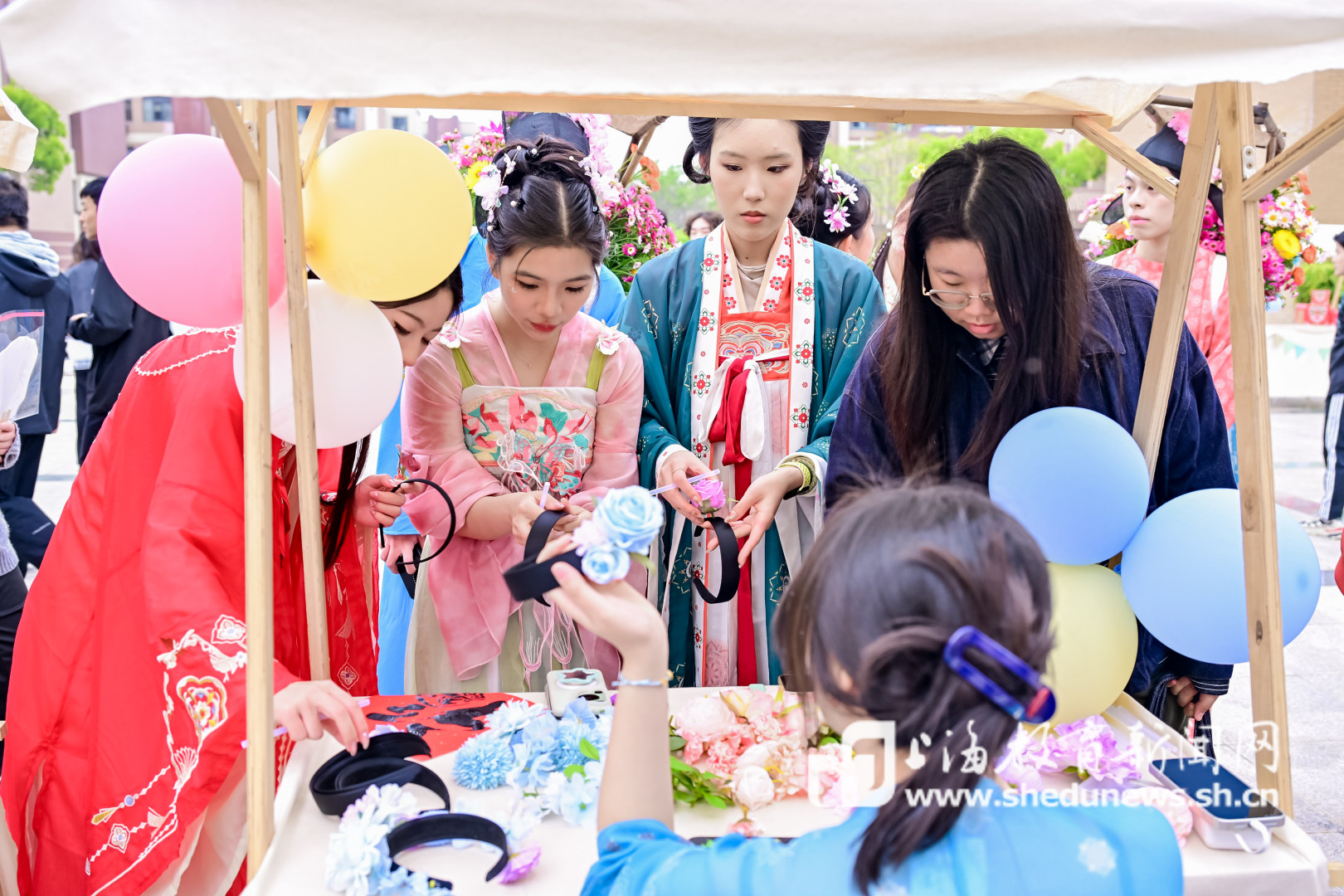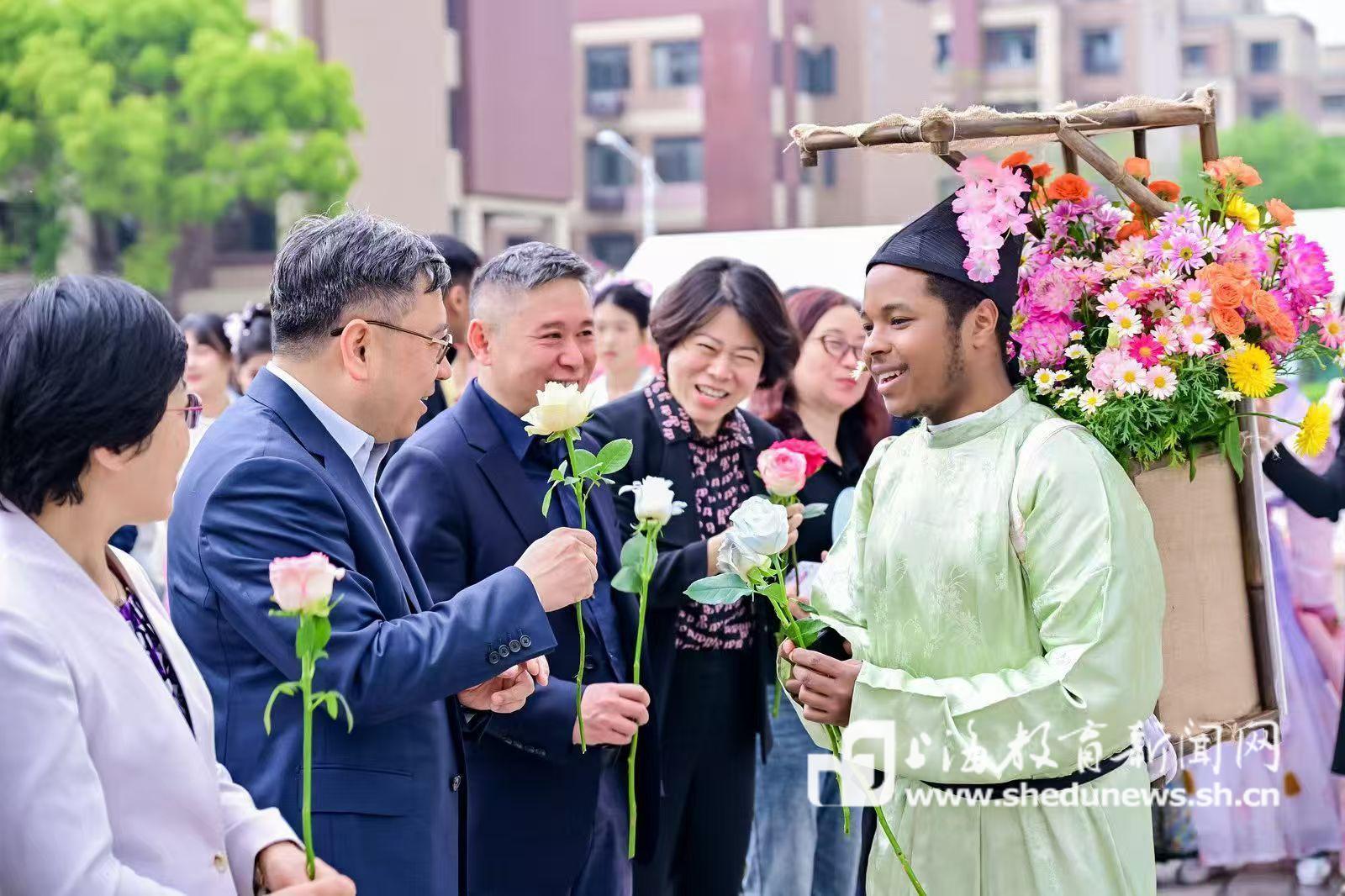 人群中,一位背着花篮、身着汉服的留学生格外引人注目。他叫AIMEN,来自科摩罗,是上海电机学院的国际学生。他在校园里穿梭,笑着将花篮里的鲜花分发给过往的师生。“看到大家接过花时眼里的笑意,和大家穿着汉服一起笑闹的瞬间,心里就被填得满满当当。”AIMEN用中文感叹,“原来分享美好,自己也会收获双倍的快乐呀。”