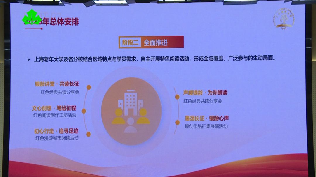 记者了解到,为了让阅读更加深入人心、形式更加丰富多彩,上海老年大学将在传统共读、分享基础上,打造“阅读+人文行走、阅读+情景朗诵、阅读+有声创作、阅读+成果展示”等沉浸式项目,让老年人在行走中读城、在朗诵中抒情、在创作中表达、在展示中收获自信。
