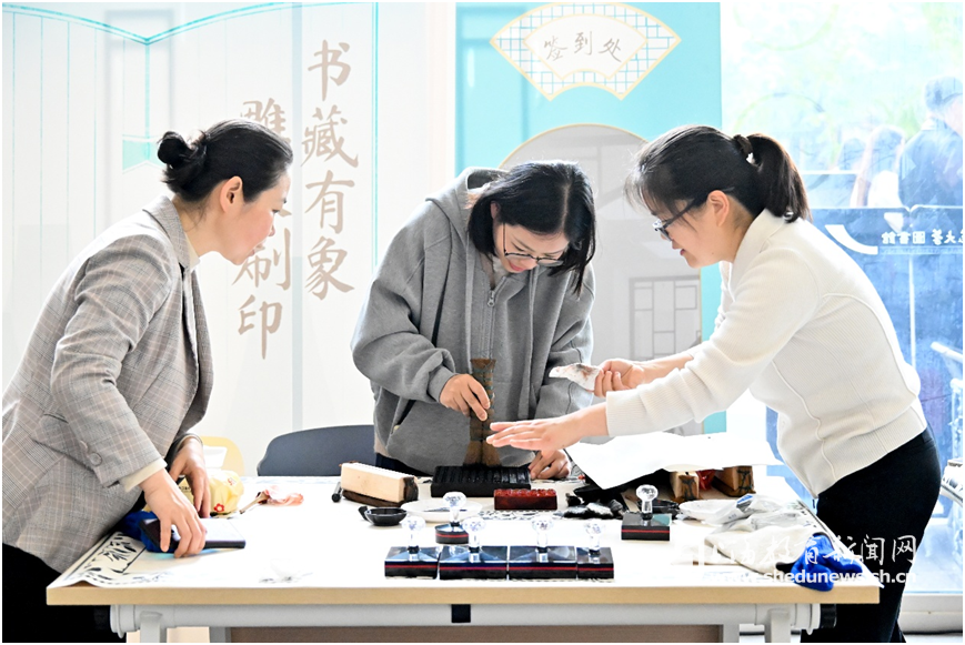 在实操体验环节,师生们兴致勃勃地围在操作台旁,纷纷化身“传统匠人”,亲身参与雕版刷印的全过程,活动现场墨香氤氲、氛围热烈。同学们纷纷称赞此次活动打破了传统阅读的单一形式,让文化传承变得可感可触、趣味十足。