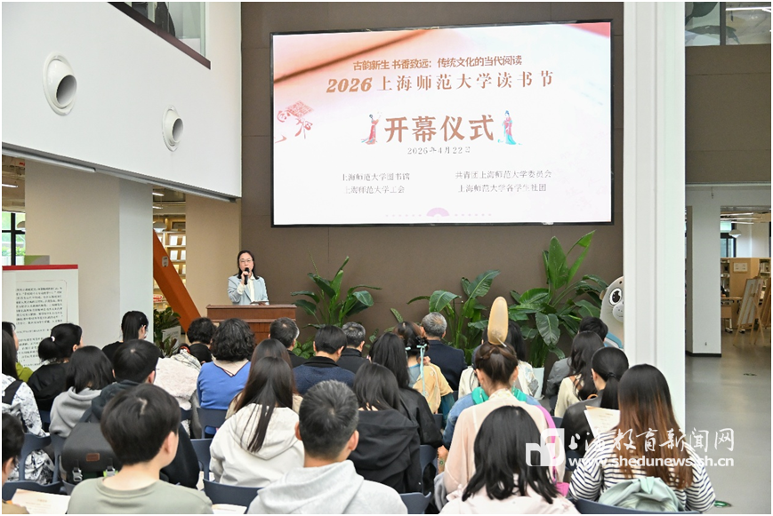 4月22日,以“古韵新生 书香致远:传统文化的当代阅读”为主题的 2026上海师范大学读书节开幕式在徐汇校区图书馆主馆举行。