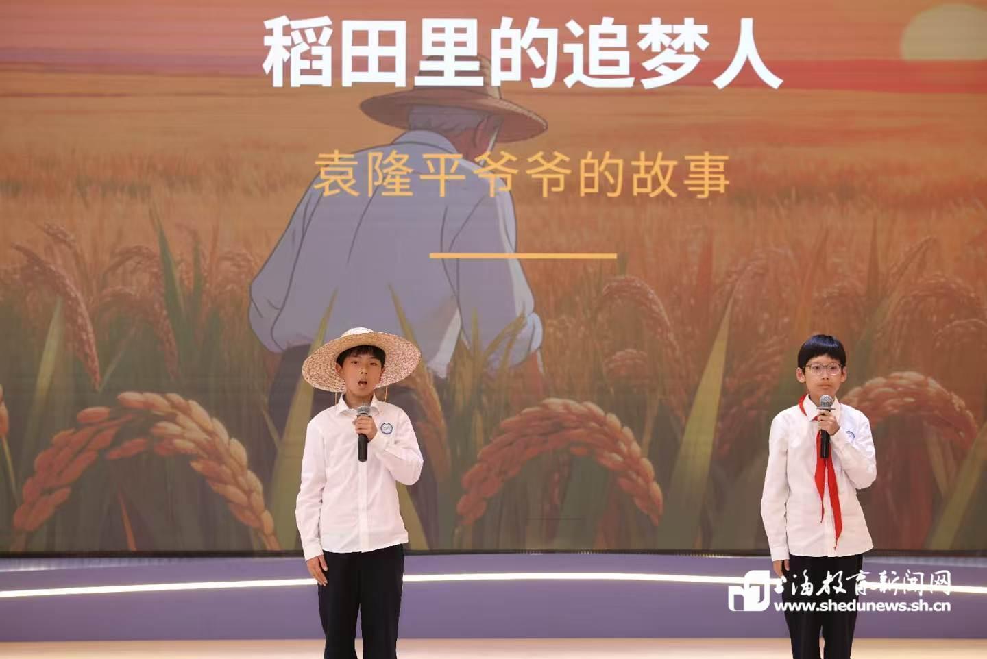 六(2)班的黄颢、王希淳同学演绎《奋斗创造奇迹——袁隆平》。从一粒种子到万家粮仓,两位同学用充满敬意的表演诠释了袁爷爷“把论文写在祖国大地上”的奋斗精神,让在场师生读懂了什么是坚持与奉献。