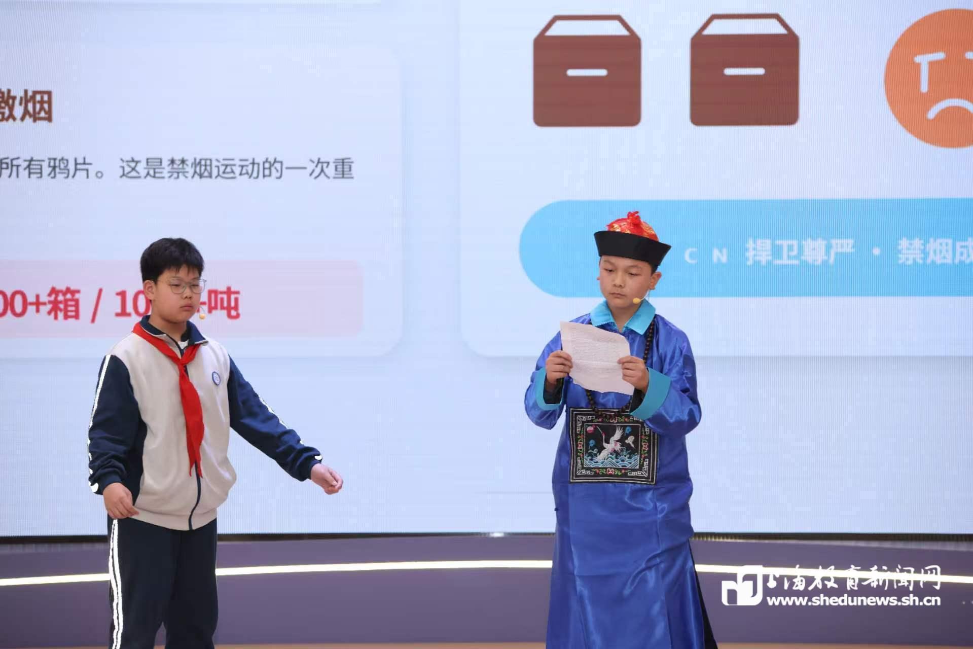 六(4)班的马林成、李昊洋同学带来《虎门销烟的故事》。他们用铿锵有力的台词和充满张力的表演,再现了林则徐“苟利国家生死以”的民族气节,让这段历史焕发出跨越时空的力量。