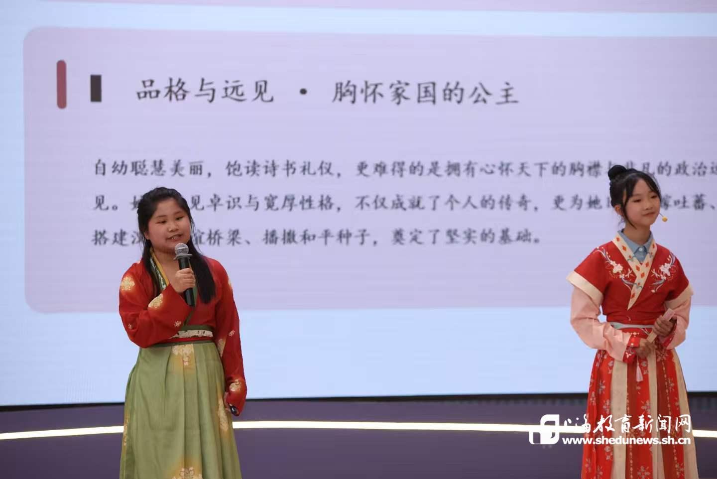 六(1)班的李欣然、姚瑶同学讲述《文成公主——用一生书写汉藏同心的传奇》。雪域高原上,文成公主用一生架起了汉藏之间的桥梁。两位同学的表演细腻而深情,将“汉藏一家亲”的理念悄然植入同龄人心中。