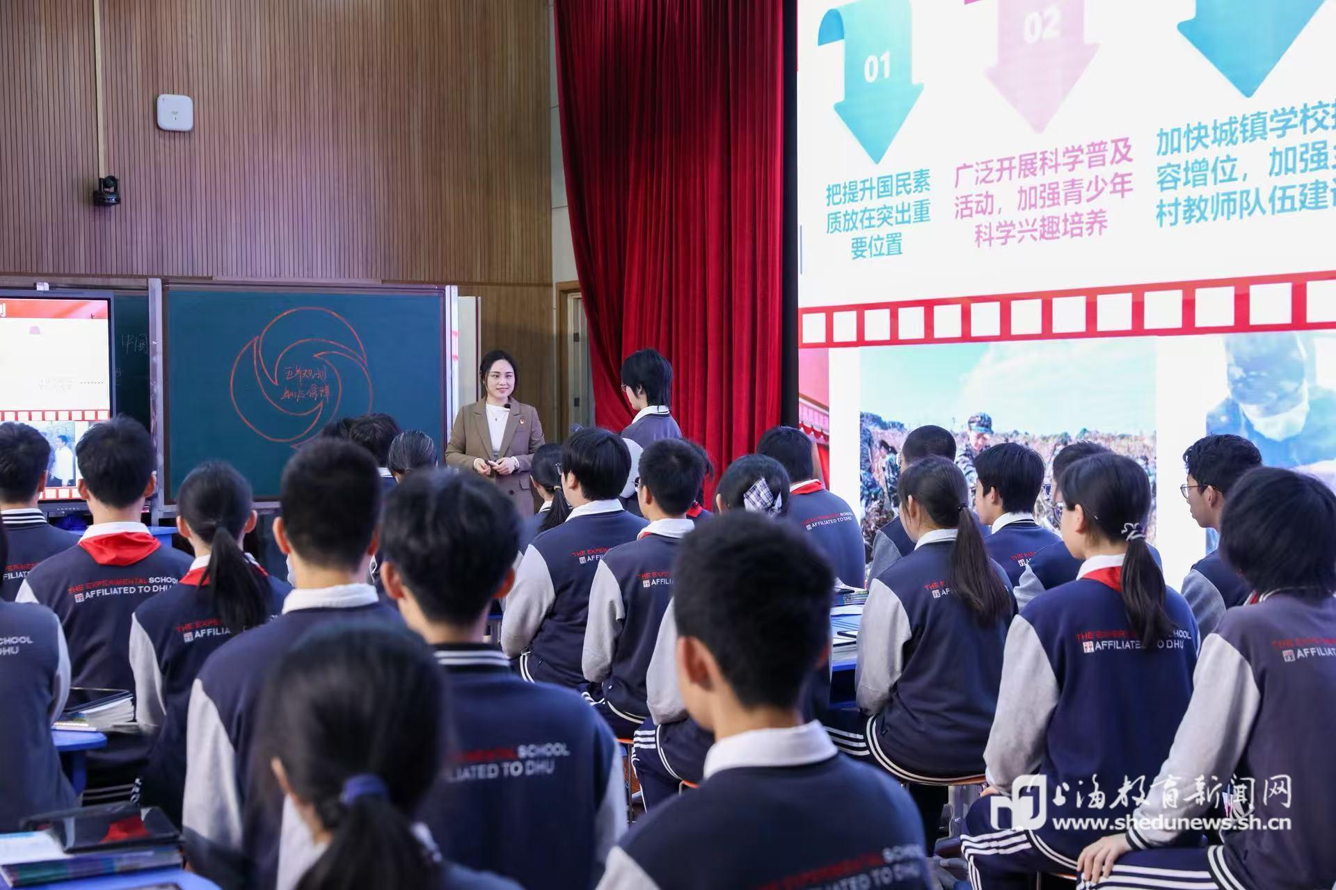 东华大学附属实验学校杨凤一老师在初中课堂“五年规划制度保障——从教育规划看中国之治的制度密码”中,以国家五年规划中的教育规划为切入点,通过“回望·‘十四五’教育变化”“解密·‘十五五’教育规划制定过程”“追问·一张蓝图何以绘到底”三个环节,引导学生从身边变化感受制度效能。课堂借助数智化工具开展合作探究,帮助学生理解党的领导、人民当家作主与依法治国有机统一,从“知道制度”走向“理解制度”,增强主人翁意识与制度自信。
