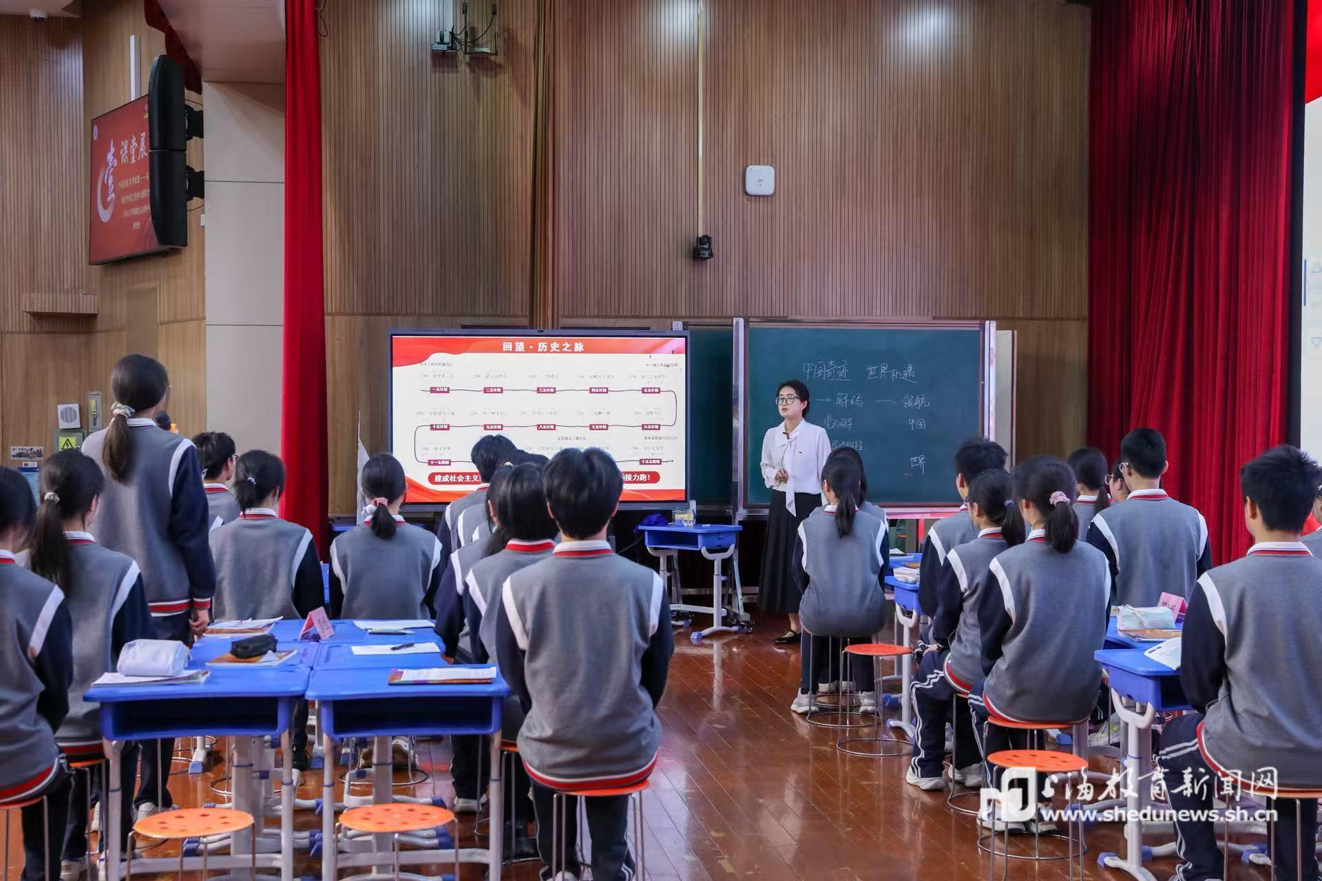本次展示活动由松江区教育局、区教育学院主办,东华大学马克思主义学院指导,东华附校、东华附高承办。在课堂观摩环节,围绕“中国之治 制度优势”这一主题精心设计了四节既独立成篇又一脉相承的“接力课堂”,呈现了从感性认知到理性认同,从家国情怀到全球视野的完整育人链条。