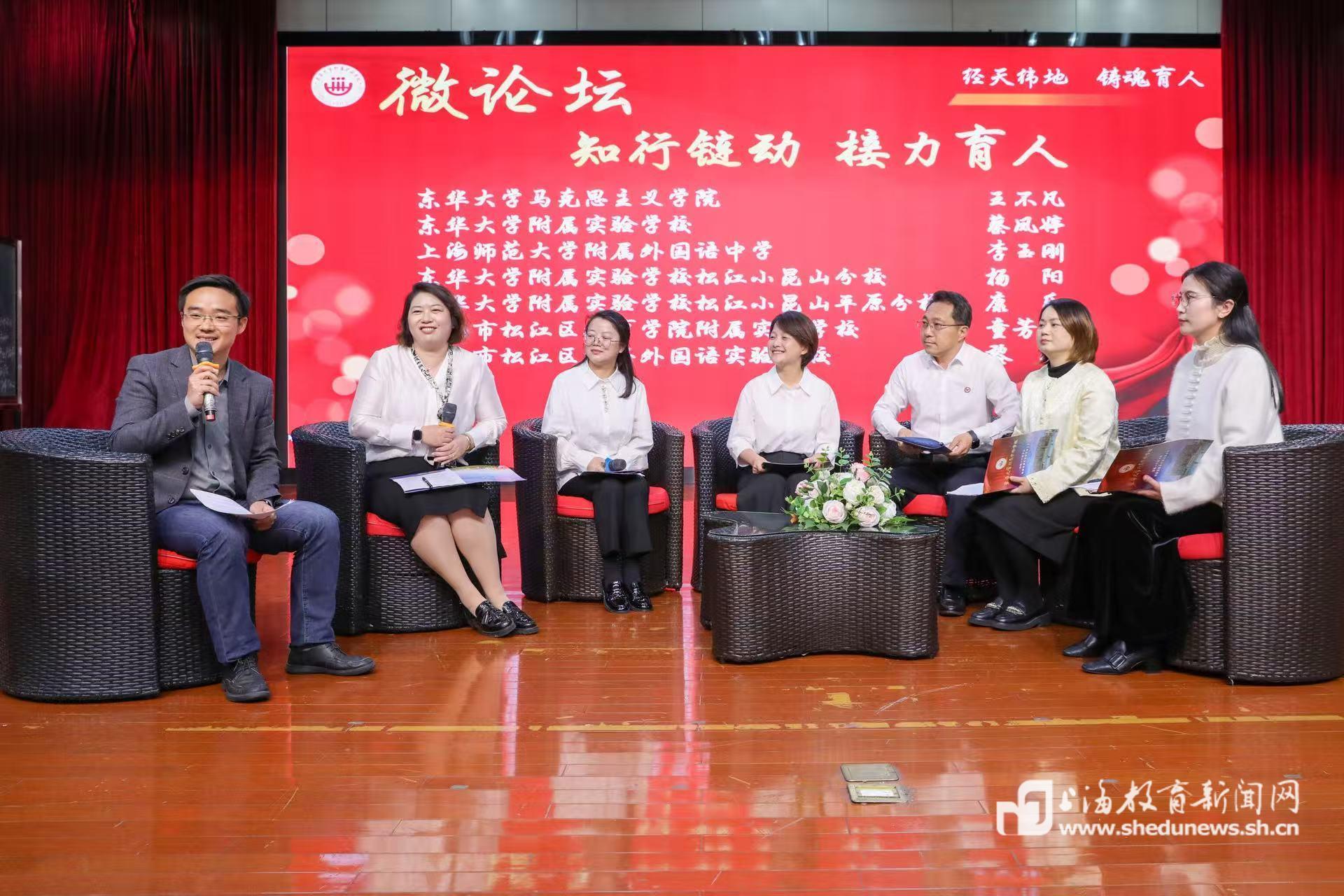 在“闪电发言”环节,松教院附校、东华附校平原分校、东华附校小昆山分校、洞泾外国语实验学校、东华附校、上师附外中等各联盟校立足自身特色,以文化传承、经典对话、理论研读、科技实践、行走研学等多元形式,通过“思政课快闪”的方式,生动展示了一校一品的思政育人成果。